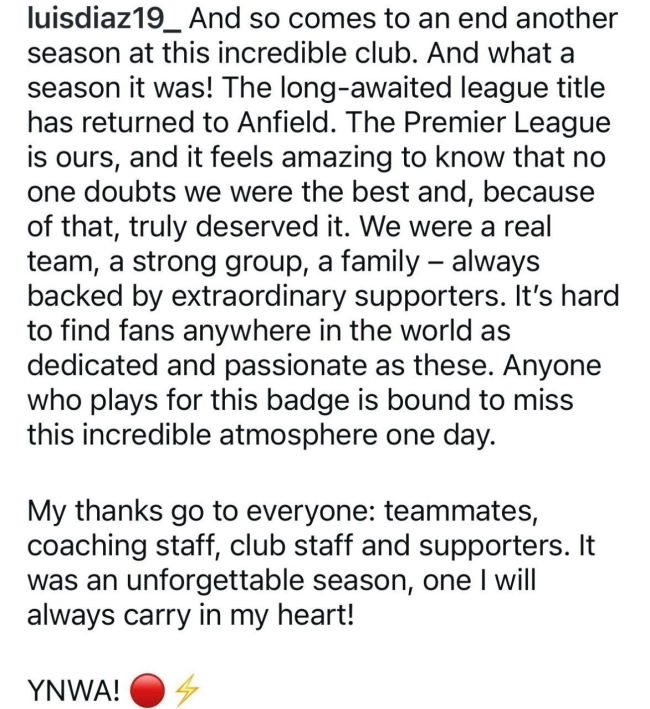 به گزارش سایت رسمی فوتبال برتر ، لوئیس دیاز، وینگر کلمبیایی لیورپول که در این فصل نیز یکی از بازیکنان تاثیرگذار قرمزهای آنفیلد بود، در صفحه خود پیامی نوشت که گمان میرود نوعی خداحافظی بوده باشد. از بارسلونا و الهلال به عنوان مقاصد احتمالی دیاز یاد میشود.