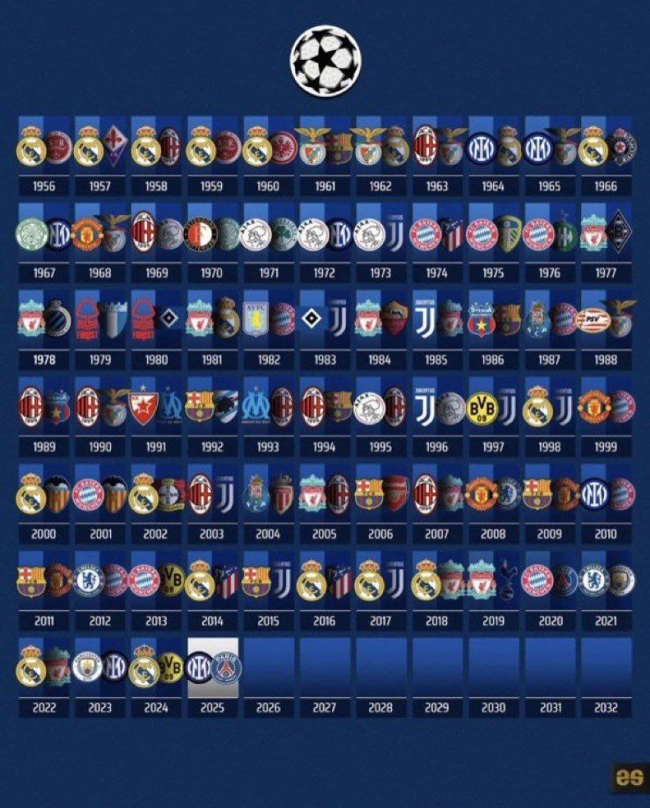 از سال 1956 تا امروز، قهرمانان اروپا در این تصویر ثبت شدهاند؛ مسیری که با قهرمانی رئال مادرید آغاز شد و فصل قبل هم با جام مادریدیها به پایان رسید.
