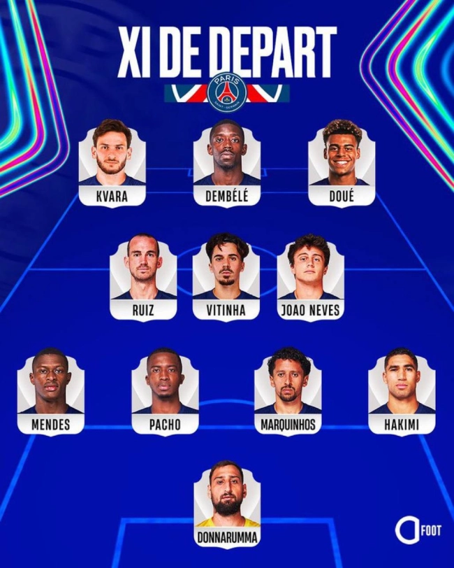 ترکیب رسمی پاریسنژرمن: جانلوئیجی دوناروما، نونو مندز،ویلیان پاچو، مارکینیوش، اشرف حکیمی، ویتینیا، ژائو نوس، فابین رویز، دزیره دوئه، خویچا کواراتسخلیا و عثمان دمبله