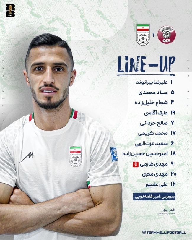ترکیب ابتدایی ایران برای دیدار مقابل قطر بهشرح ذیل است:
