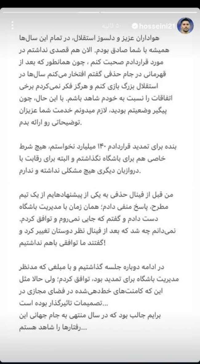 استقلال در تمام این سالها همیشه با شما صادق بودم الان هم قصد نداشتم در مورد قراردادم صحبت کنم چون همانطور که بعد از قهرمانی در جام حذفی گفتم افتخار میکنم سالها در استقلال بزرگ بازی کنم و هرگز فکر نمیکردم برخی اتفاقات را نسبت به خودم شاهد باشم با این حال چون پیگیر وضعیتم بودید لازم میدانم خدمت شما عزیزان توضیحاتی را ارائه بدهم.