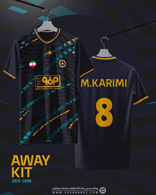 باشگاه سپاهان اصفهان از پیراهن دوم خود هم برای فصل جدید رونمایی کرد. این پیراهن با زمینه سرمهای، مشکی و جزئیات فیروزهای و طلایی طراحی شده است و ترکیبی از وقار، اصالت و هویت شهر اصفهان را به نمایش میگذارد.