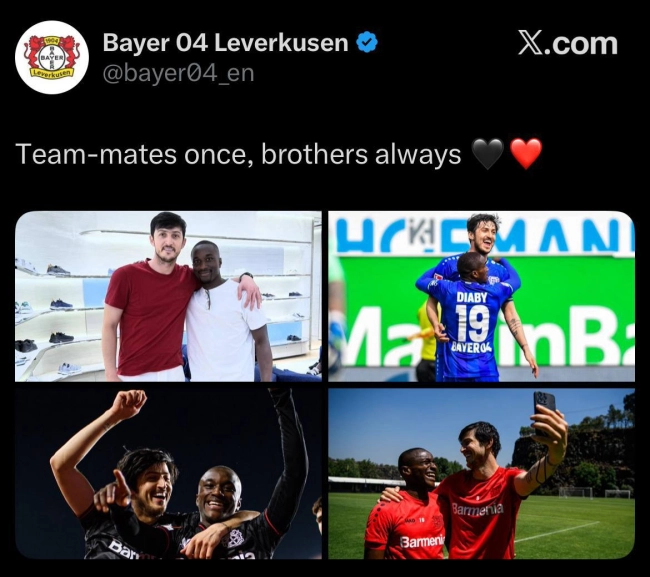 حالا باشگاه بایر لورکوزن در صفحه ایکس خود با انتشار دوباره این تصویر و سه تصویر دیگر از رفاقت آزمون و دیابی در لورکوزن، به این شکل به رفاقت این دو بازیکن سابق باشگاه واکنش نشان داده است: «یک‌بار هم‌تیمی بودیم اما همیشه برادر خواهیم ماند.»