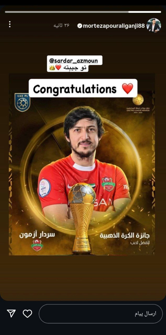 به گزارش سایت رسمی فوتبال برتر ؛ بعد از اینکه سردار آزمون موفق شد توپ طلای بهترین بازیکن خارجی فوتبال امارات را از آن خود کند، موجی از واکنشهای مثبت توسط همتیمیهای او به راه افتاد.