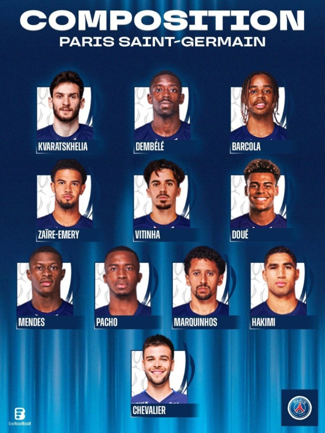 پاریسنژرمن: شوالیه، حکیمی، مارکینیوش، پاچو، مندش، ویتینیا، دوئه، زئیر امری، بارکولا، کواراتسخلیا و دمبله