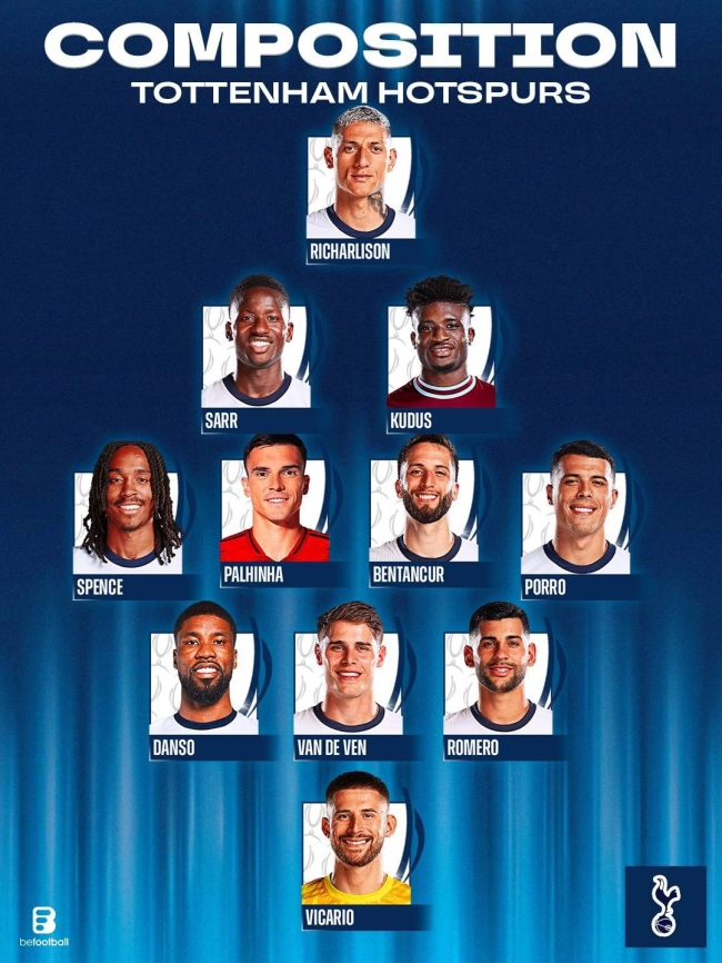 تاتنهام: ویکاریو، رومرو، فندفن، دانسو، پورو، بنتانکور، پالینیا، اسپنس، سار، کودوس و ریچارلیسون