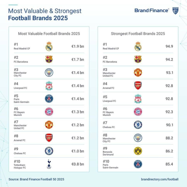 به گزارش سایت رسمی فوتبال برتر ؛ رئال مادرید همچنان باارزشترین برند فوتبالی جهان است.