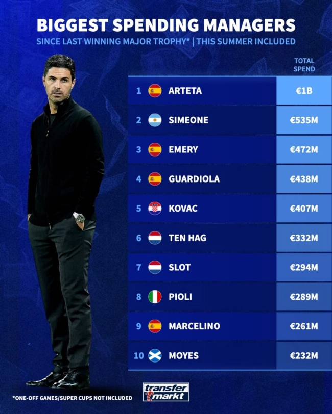 آمارهای اخیر نشان میدهد که برخی از سرمربیان مطرح فوتبال جهان، با وجود صرف مبالغ هنگفت، همچنان در حسرت کسب جامهای بزرگ باقی ماندهاند. در صدر این لیست، میکل آرتتا، سرمربی آرسنال، قرار دارد که پس از آخرین قهرمانی تیمش، بیش از ۱ میلیارد یورو هزینه کرده است. با این حال در این فهرست چند استثنا مثل پپ گواردیولا و آرنه اسلات هم هستند که علیٰرغم هزینههای زیاد جامهای بزرگی بدست آوردهاند.