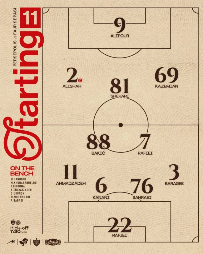 نکته جالب این ترکیب، حضور فرشاد احمدزاده در پست دفاع چپ به جای میلاد محمدی است؛ ضمن اینکه با وجود مصدومیت، اوستون اورونوف و تیوی بیفوما روی نیمکت پرسپولیس قرار گرفته‌اند. سردار دورسون نیز غایب بزرگ لیست پرسپولیس در کنار پیام نیازمند، اوریه، سرلک، سلمانی، امیری و مهری است.