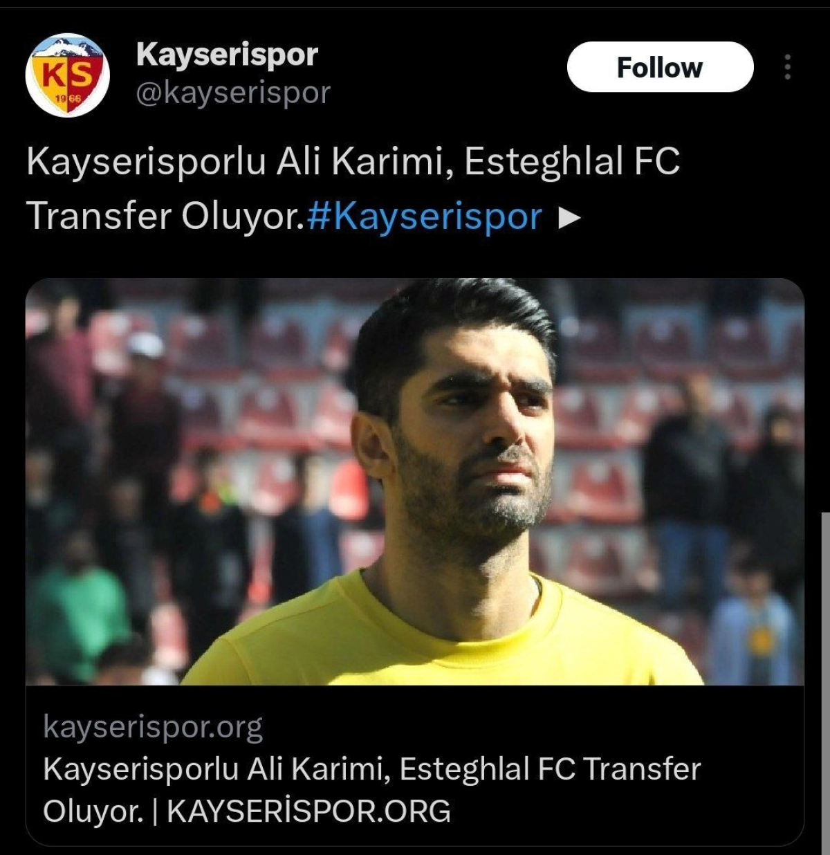 به گزارش سایت رسمی فوتبال برتر؛ باشگاه کایسریاسپور در صفحه رسمی خود در فضای مجازی، به صورت رسمی خبر پیوستن علی کریمی به استقلال را اعلام کرد.