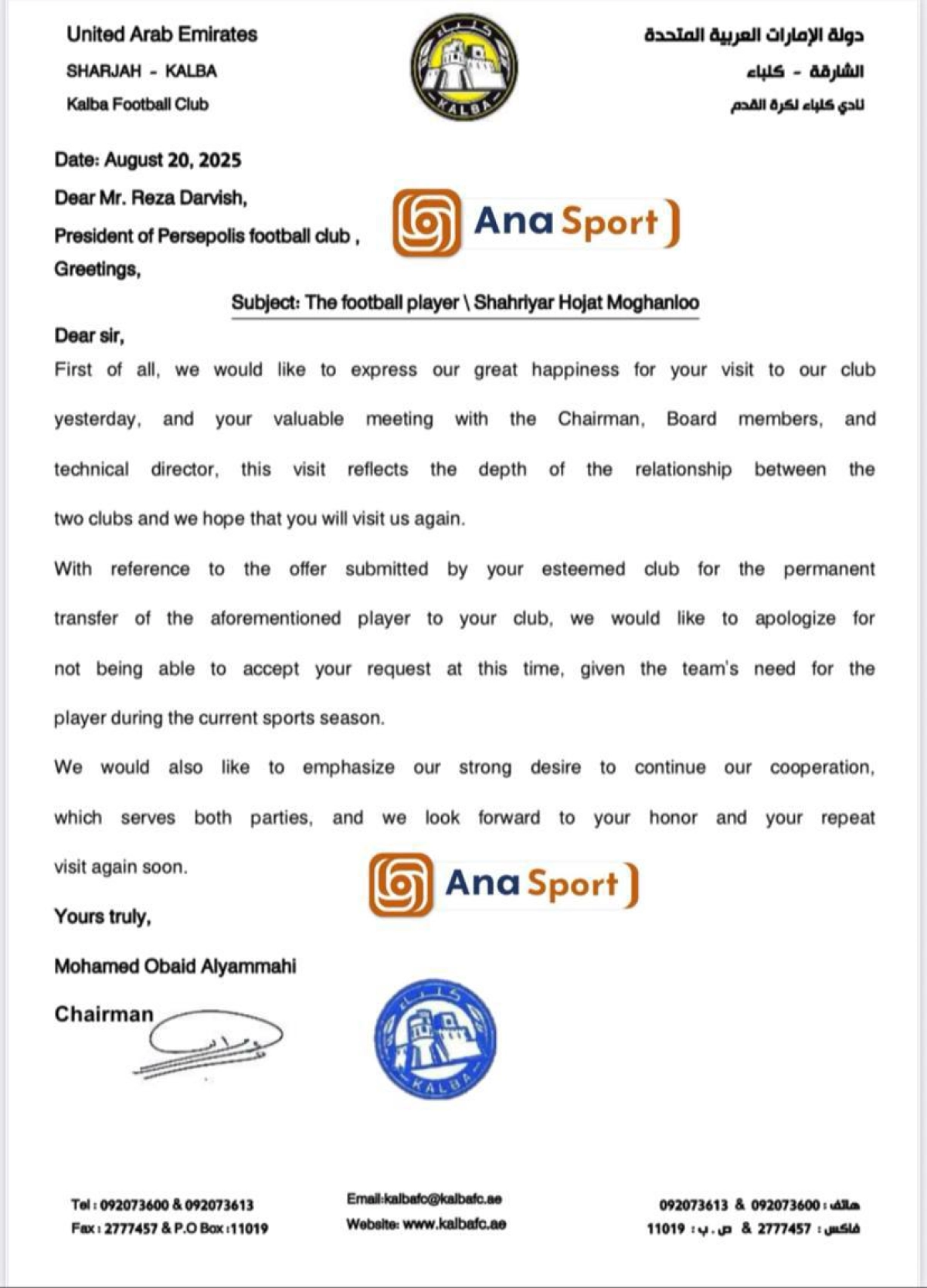 «با توجه به پیشنهاد ارائه شده توسط باشگاه محترم شما برای انتقال دائمی بازیکن مذکور به باشگاه شما، از اینکه با توجه به نیاز تیم به این بازیکن در فصل ورزشی جاری، نمی‌توانیم درخواست شما را در حال حاضر بپذیریم، عذرخواهی می‌کنیم. ما همچنین مایلیم بر تمایل شدید خود برای ادامه همکاری، که به نفع هر دو طرف است، تأکید کنیم و مشتاقانه منتظر حضور مجدد شما و بازدید شما در آینده‌ای نزدیک هستیم. با احترام، محمد عبید الیامحی؛ رئیس.»