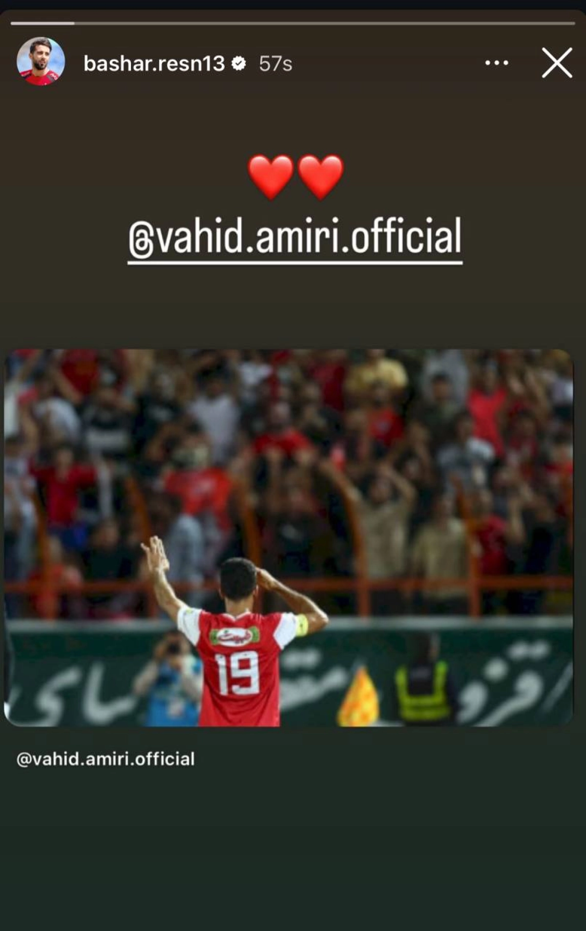 بر همین اساس، بشار رسن هافبک عراقی سابق پرسپولیس که چند فصلی را در کنار امیری توپ زده، یک استوری‌ منتشر کرد و با دو قلب قرمز به خبر جدایی امیری واکنش نشان داد.