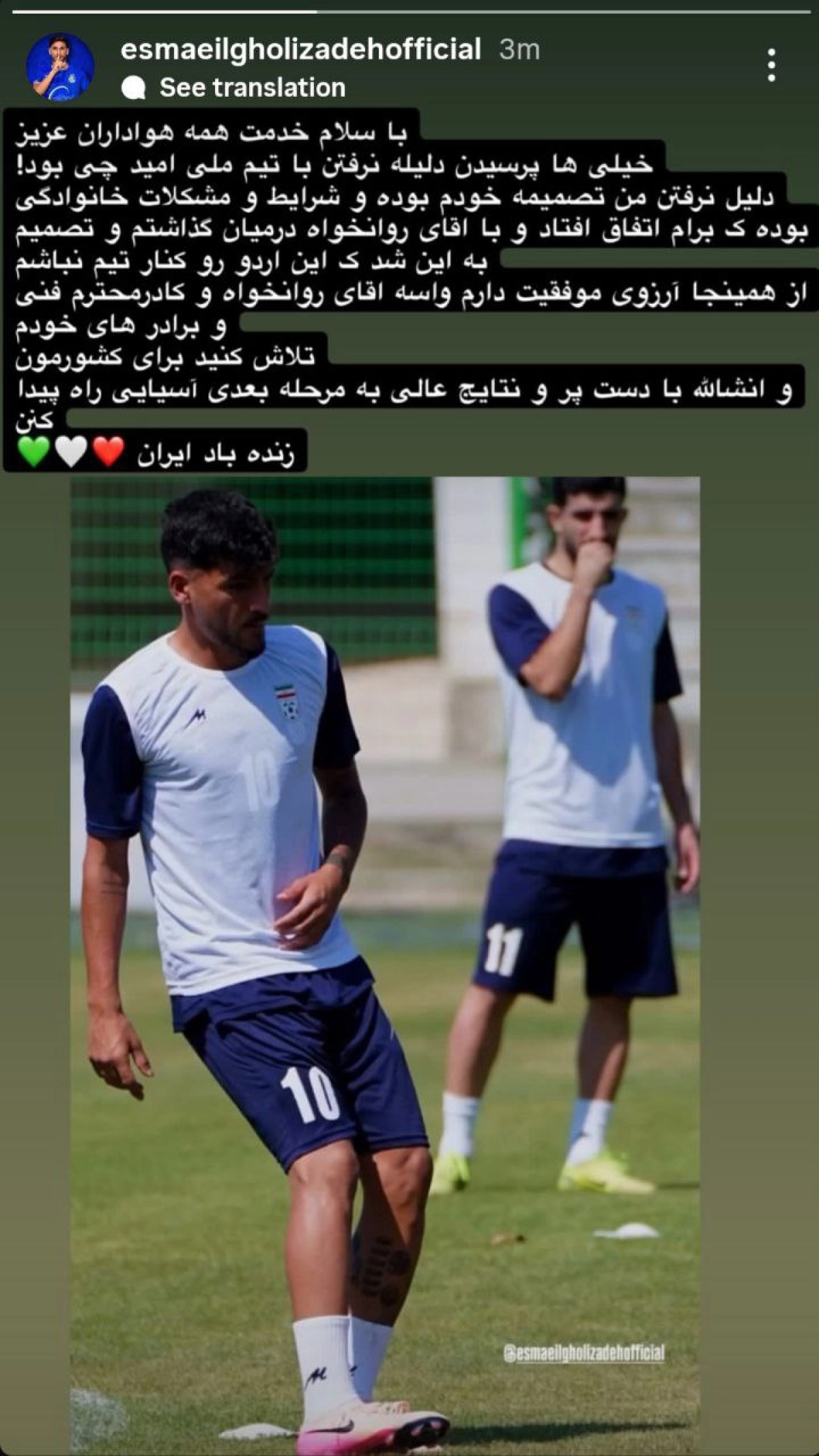 «با سلام خدمت همه هواداران عزیز. خیلیها پرسیدند دلیل نرفتن با تیم ملی امید چی بود. دلیل نرفتن من تصمیم خودم بوده و شرایط و مشکلات خانوادگی بوده که برایم اتفاق افتاد و با آقای روانخواه در میان گذاشتم و تصمیم به این شد که این اردو را کنار تیم نباشم. از همینجا آرزوی موفقیت دارم برای آقای روانخواه و کادر فنی محترم و برادرهای خودم. تلاش کنید برای کشورمان و انشاالله با دست پر و نتایج عالی به مرحله بعدی آسیایی راه پیدا کنند. زندهباد ایران.»