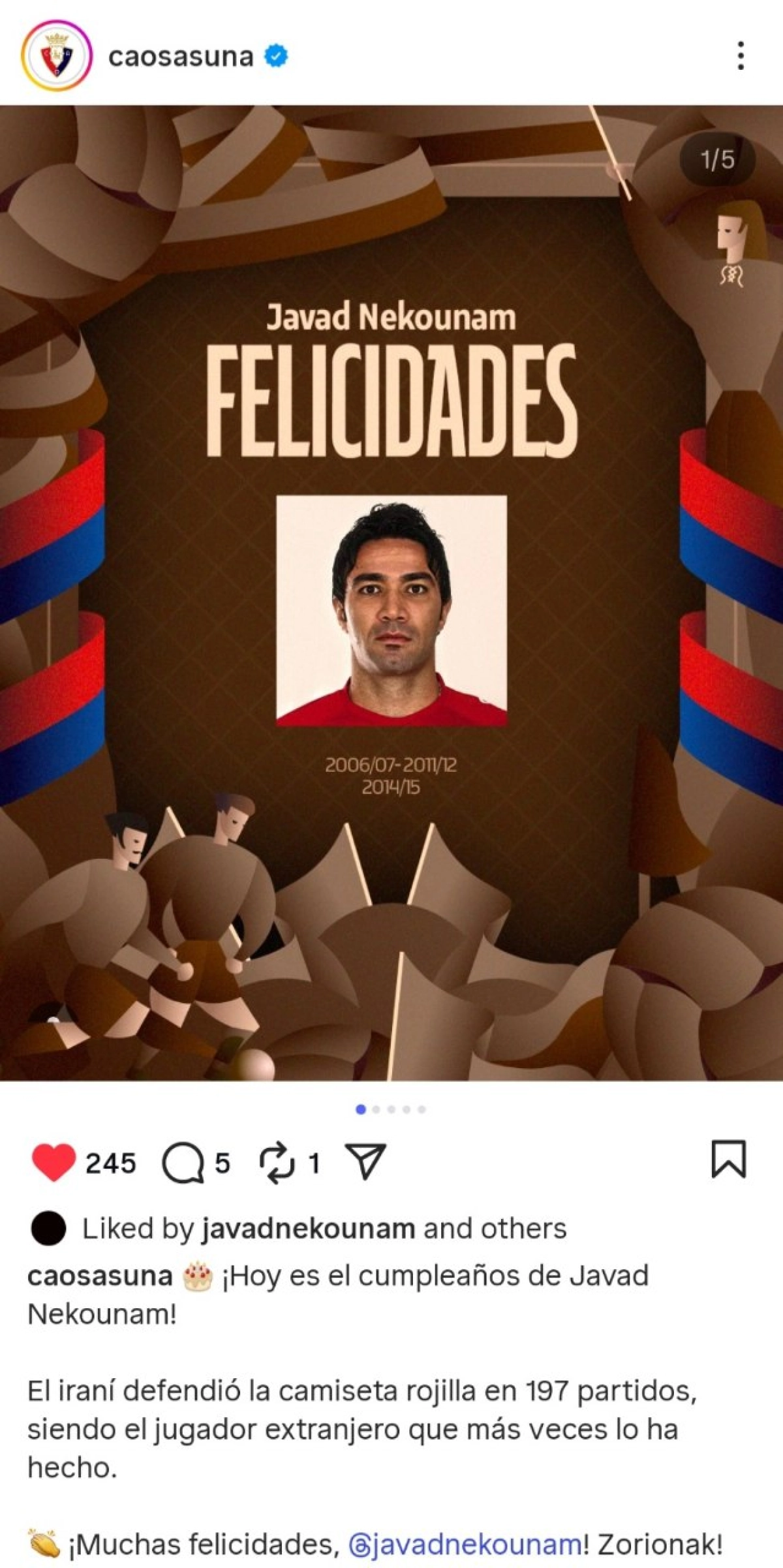 به گزارش سایت رسمی فوتبال برتر؛ باشگاه اوساسونا اسپانیا، با انتشار پیامی در شبکه‌های اجتماعی، تولد جواد نکونام، کاپیتان سابق تیم ملی ایران و بازیکن سابق این باشگاه را تبریک گفت.