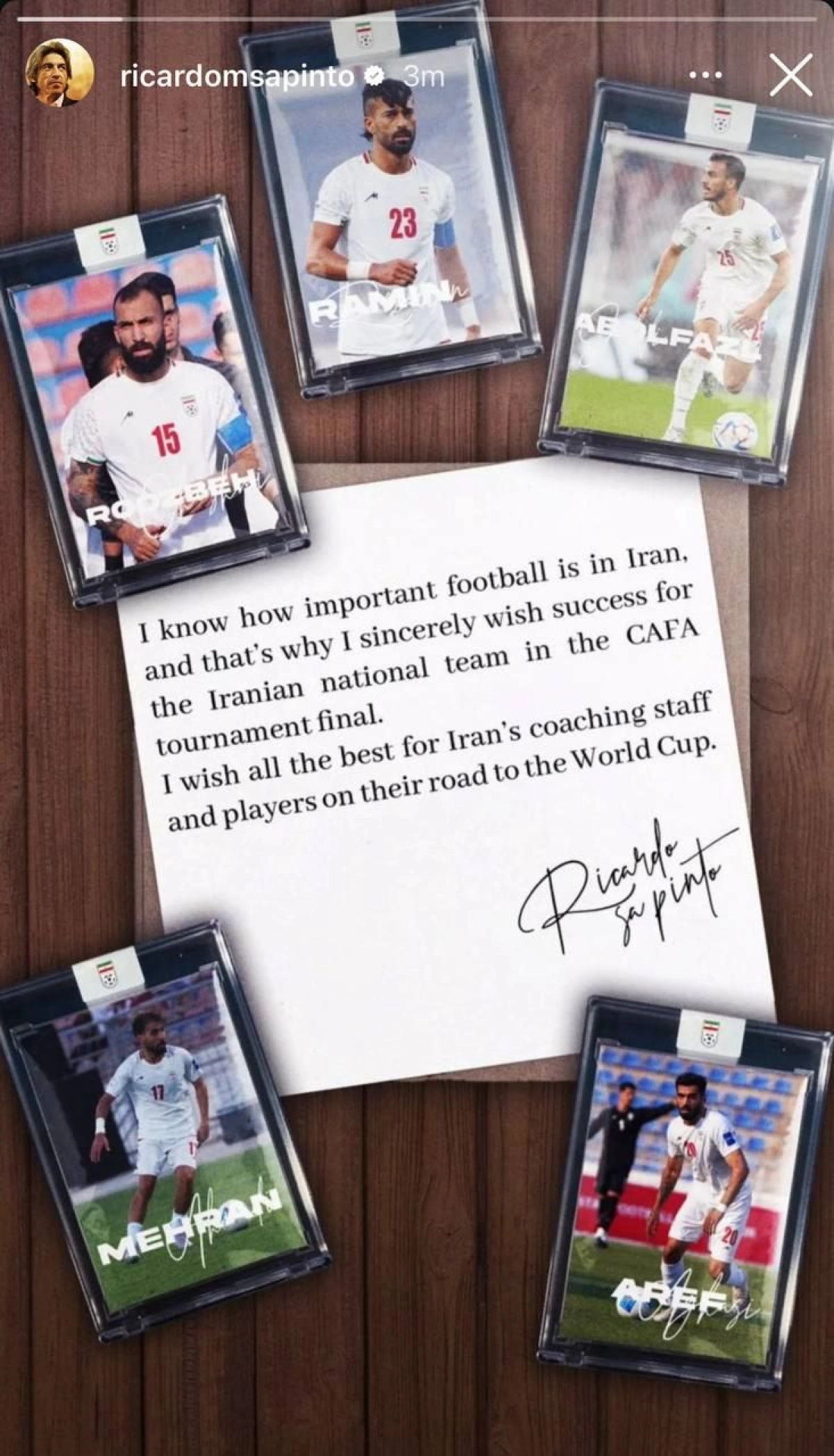 به گزارش سایت رسمی فوتبال برتر؛ ریکاردو ساپینتو، سرمربی تیم فوتبال استقلال تهران، با انتشار پیامی حمایتی و دوستانه، برای تیم ملی فوتبال ایران آرزوی موفقیت کرد.