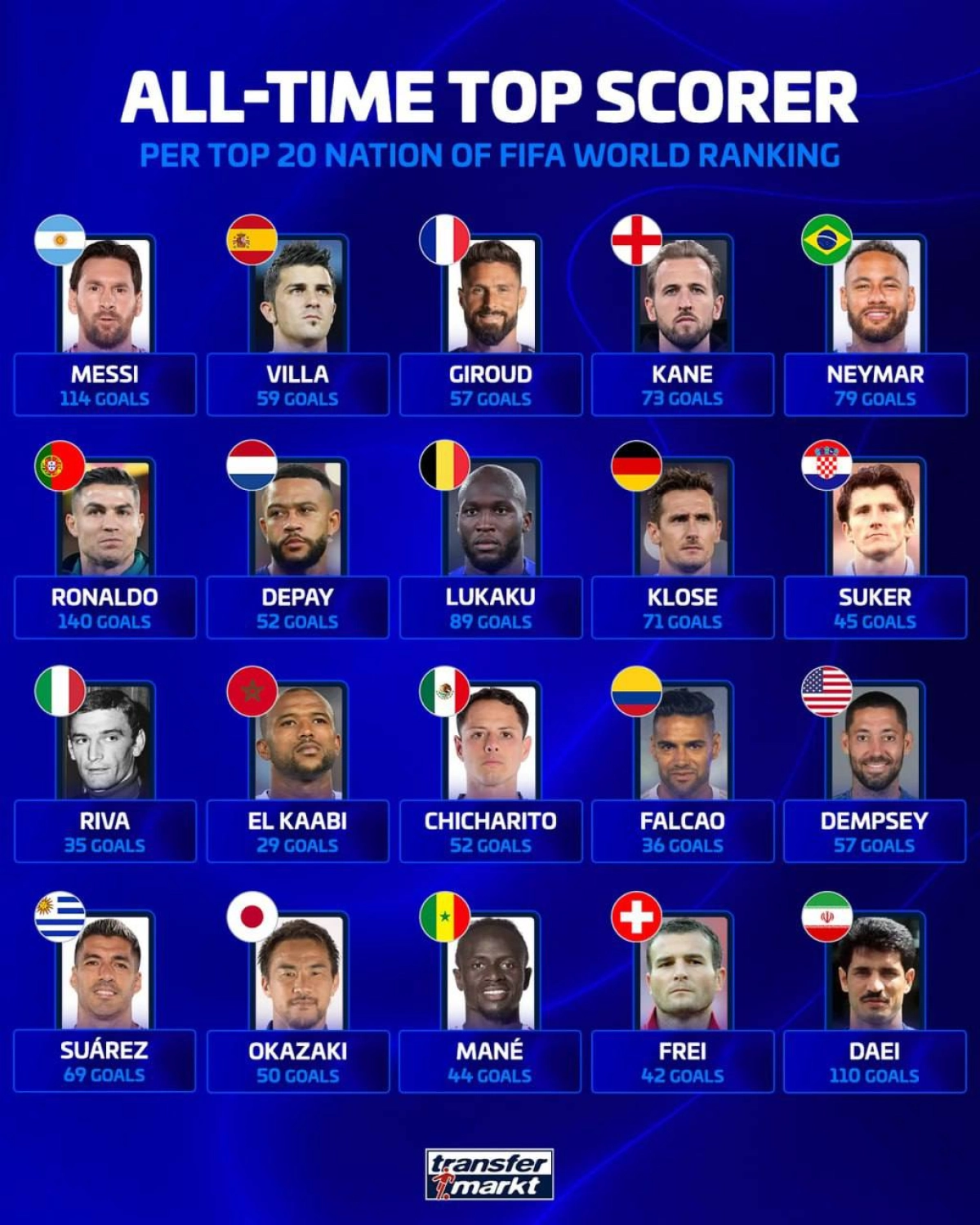به گزارش سایت رسمی فوتبال برتر ؛  برترین گلزنان تاریخ ۲۰ تیم برتر فیفا اعلام شد.