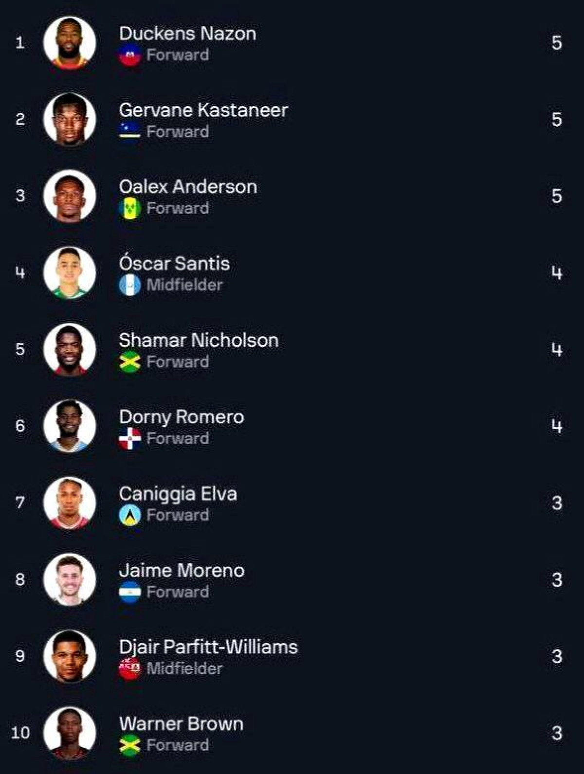به گزارش سایت رسمی فوتبال برتر؛ داکنز نازون، ستاره تیم ملی هائیتی، با هتتریکی که در بازی دیشب به ثمر رساند، با مجموع ۵ گل در صدر جدول برترین گلزنان منطقه آمریکای مرکزی قرار گرفت.