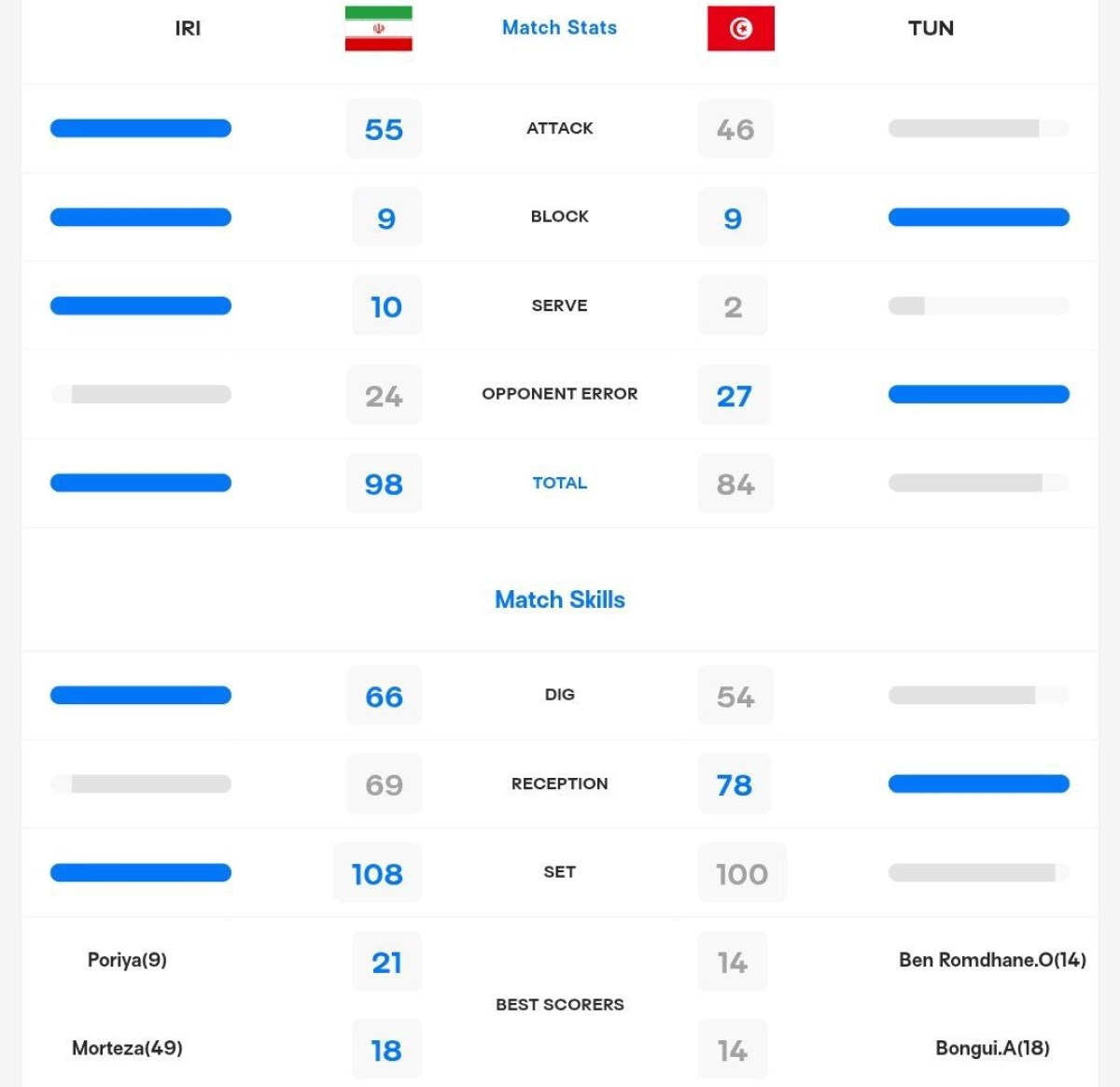 تونس ست سوم را بهتر آغاز کرد، اما دو سرویس مستقیم مرتضی شریفی ورق را برگرداند. سرویس‌های هدفمند ایران دریافت حریف را مختل کرد و هرچند امتیازات پایانی حساس دنبال شد، تایم اوت روبرتو پیاتزا باعث تمرکز بیشتر شاگردانش شد و ایران ۲۵ بر ۲۳ پیروز شد.
