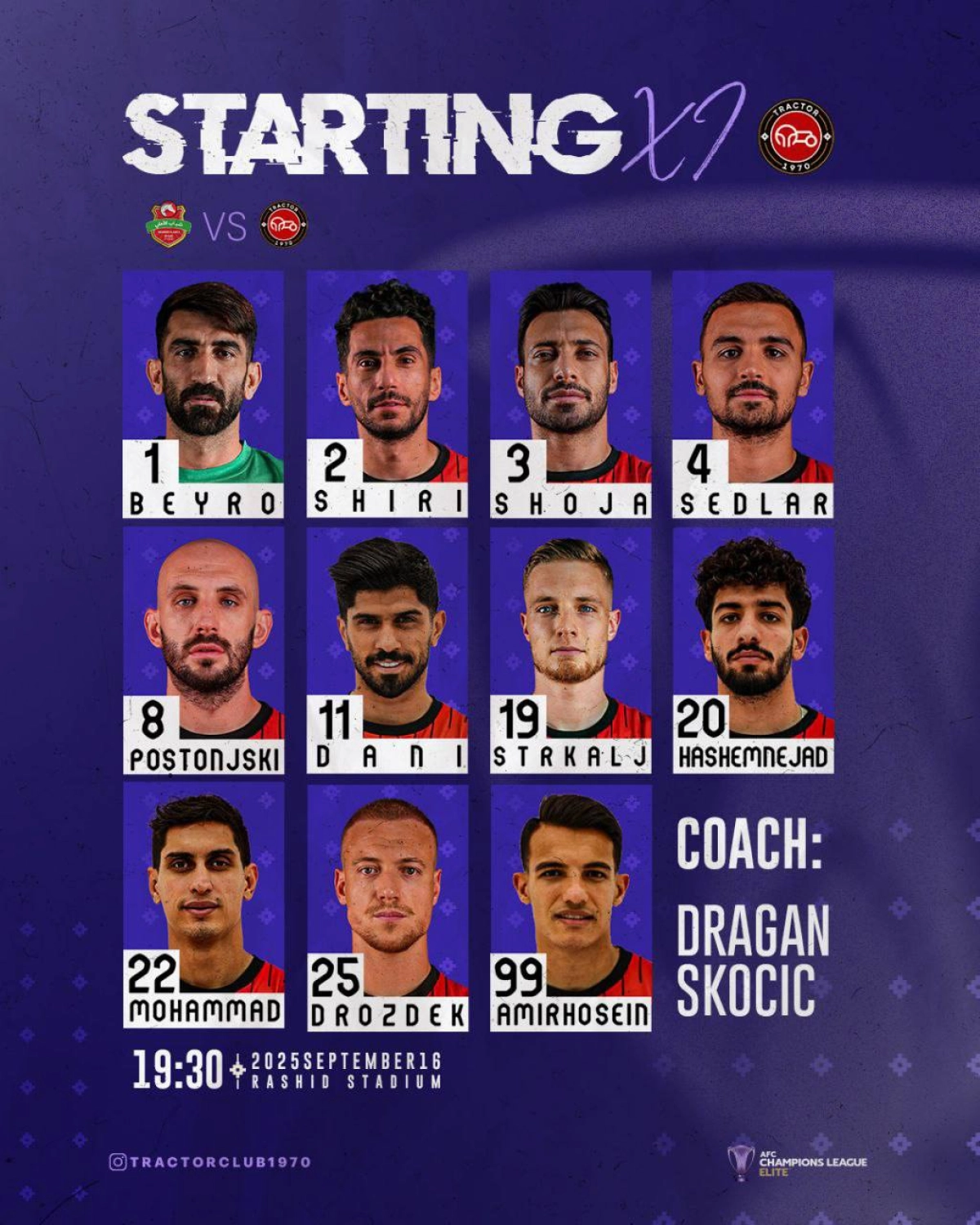 علیرضا بیرانوند پس از تعلیق محرومیت خود، در ترکیب اصلی تراکتور قرار دارد. ضمن اینکه اسکوچیچ برای اولین بار از دروژدک و اشترکال به صورت همزمان استفاده کرده است.