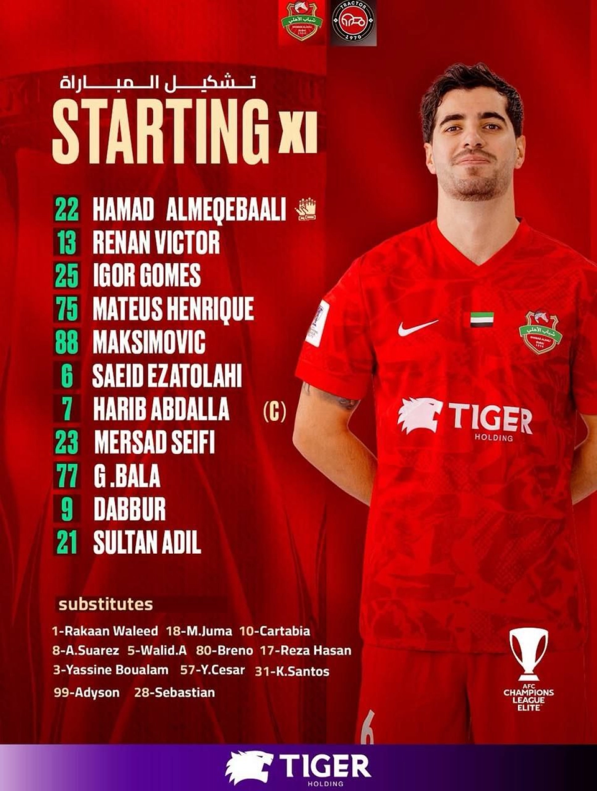 رضا غندیپور دیگر بازیکن ایرانی این تیم هم روی نیمکت قرار دارد. بدین ترتیب، الاهلی امشب مقابل تراکتور با سه هموطن ایرانی وارد رقابتهای لیگ نخبگان آسیا شده است.