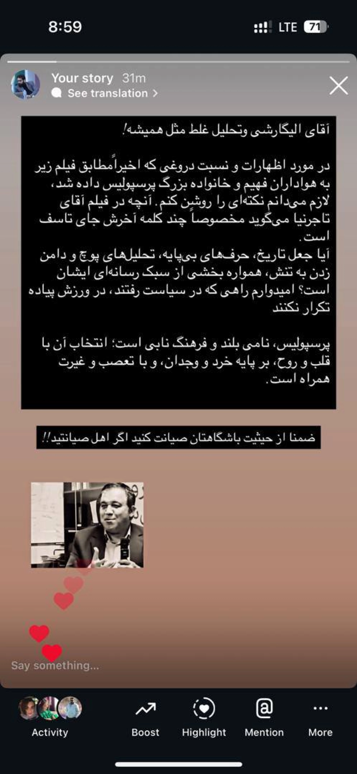 علی اینانلو، عضو هیئت‌مدیره پرسپولیس، در واکنش به کلیپی از اظهارات تاجرنیا خطاب به او نوشت: اگر اهل صیانتید، از حیثیت باشگاه‌تان صیانت کنید!