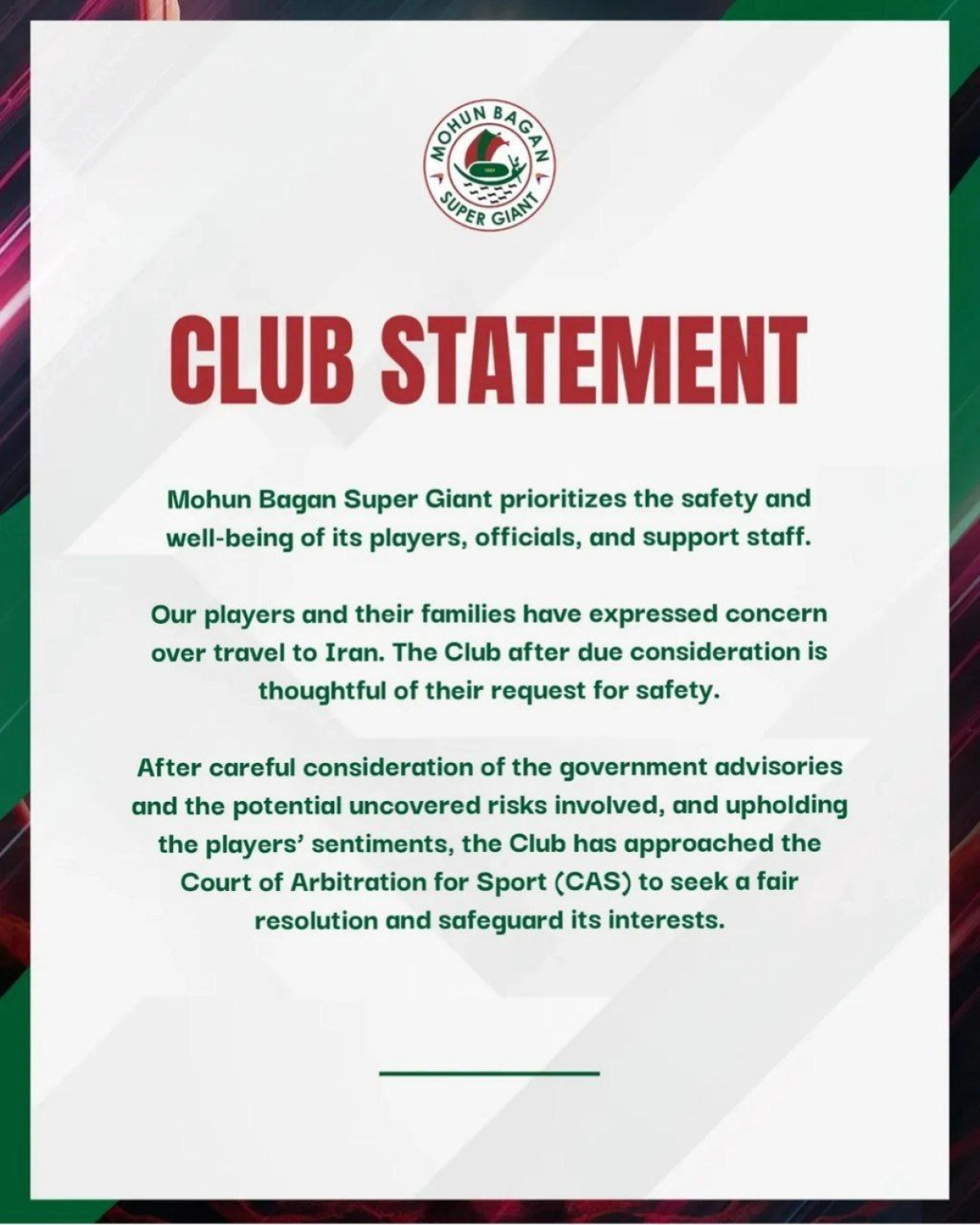باشگاه موهون باگان هند در بیانیه رسمی خود که ساعاتی پیش منتشر شد، به شکلی اغماضآمیز در اولویتهای خود تأکید کرده است. در این بیانیه که بهانهجویانه بنظر میرسد، آمده: «ما حفظ ایمنی و سلامت بازیکنان، مسئولان و اعضای کادرمان را در اولویت قرار میدهیم.»