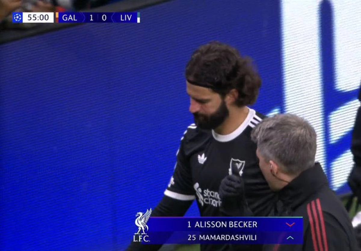 در جریان دیدار لیورپول مقابل گالاتاسرای، دو بازیکن این تیم دچار مصدومیت شدند و نگرانیهایی برای کادر فنی ایجاد کردند. آلیسون بکر، دروازهبان اصلی لیورپول، در دقیقه ۵۶ به دلیل آسیب از ناحیه زانو زمین را ترک کرد و جای خود را به گئورگی مامارداشویلی داد. آلیسون تا پیش از مصدومیت، چند واکنش مهم برای تیمش داشت.