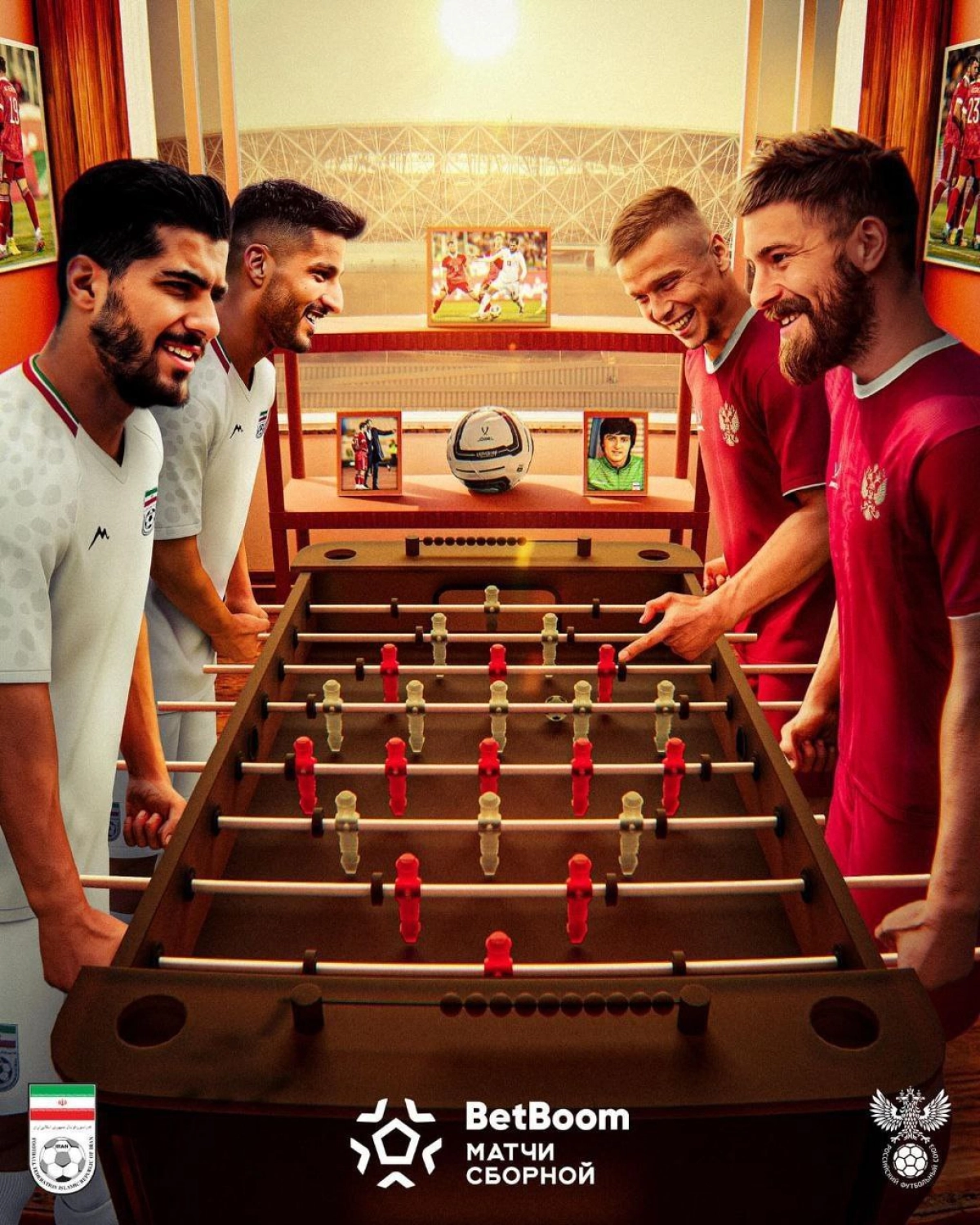 در کانون توجه این پوستر، یک میز فوتبال دستی به چشم می‌خورد که دو بازیکن، یکی نماینده ایران و دیگری نماینده روسیه، در حال رقابت با یکدیگر هستند. این تصویر به وضوح نشان‌دهنده یک تقابل دوستانه و ورزشی میان دو کشور است که در فضایی صمیمی و رقابتی برگزار خواهد شد.