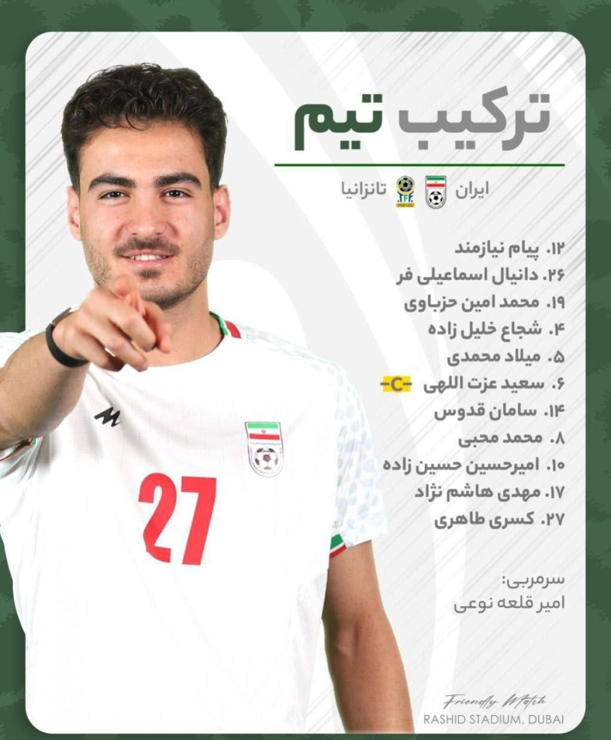 ترکیب متفاوت ایران برای این مسابقه به شکل زیر از سوی امیر قلعهنویی اعلام شده است: