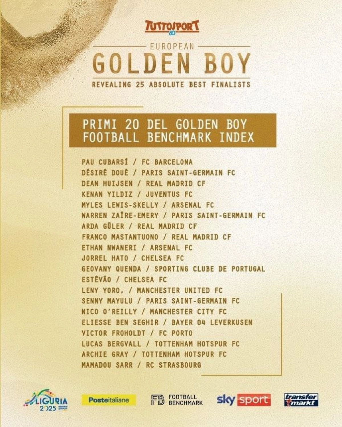 به گزارش سایت رسمی فوتبال برتر ؛ نشریه معتبر توتو اسپورت فهرست نهایی ۲۵ بازیکن نامزد دریافت جایزه «گلدن بوی ۲۰۲۵» را به‌صورت رسمی منتشر کرد. این جایزه هر سال به بهترین فوتبالیست زیر ۲۱ سال فعال در اروپا اهدا می‌شود.