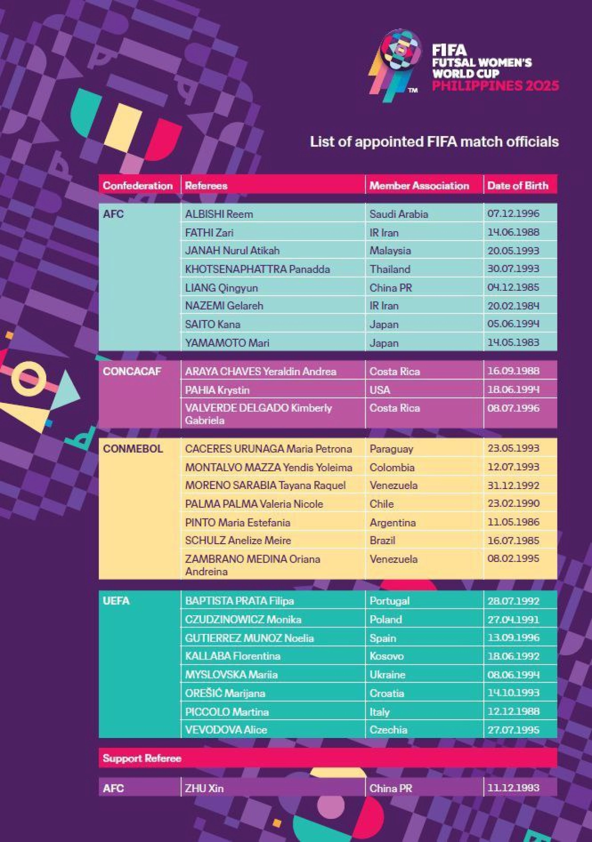 با اعلام رسمی کمیته داوران فیفا، از جمهوری اسلامی ایران، «زری فتحی» و «گلاره ناظمی» به عنوان داوران قضاوت‌کننده در رقابت‌های جام جهانی فوتسال بانوان ۲۰۲۵- فیلیپین انتخاب شده‌اند. این انتخاب نشان‌دهنده سطح بالای دانش و تجربه این دو داور برجسته ایرانی در عرصه بین‌المللی است.