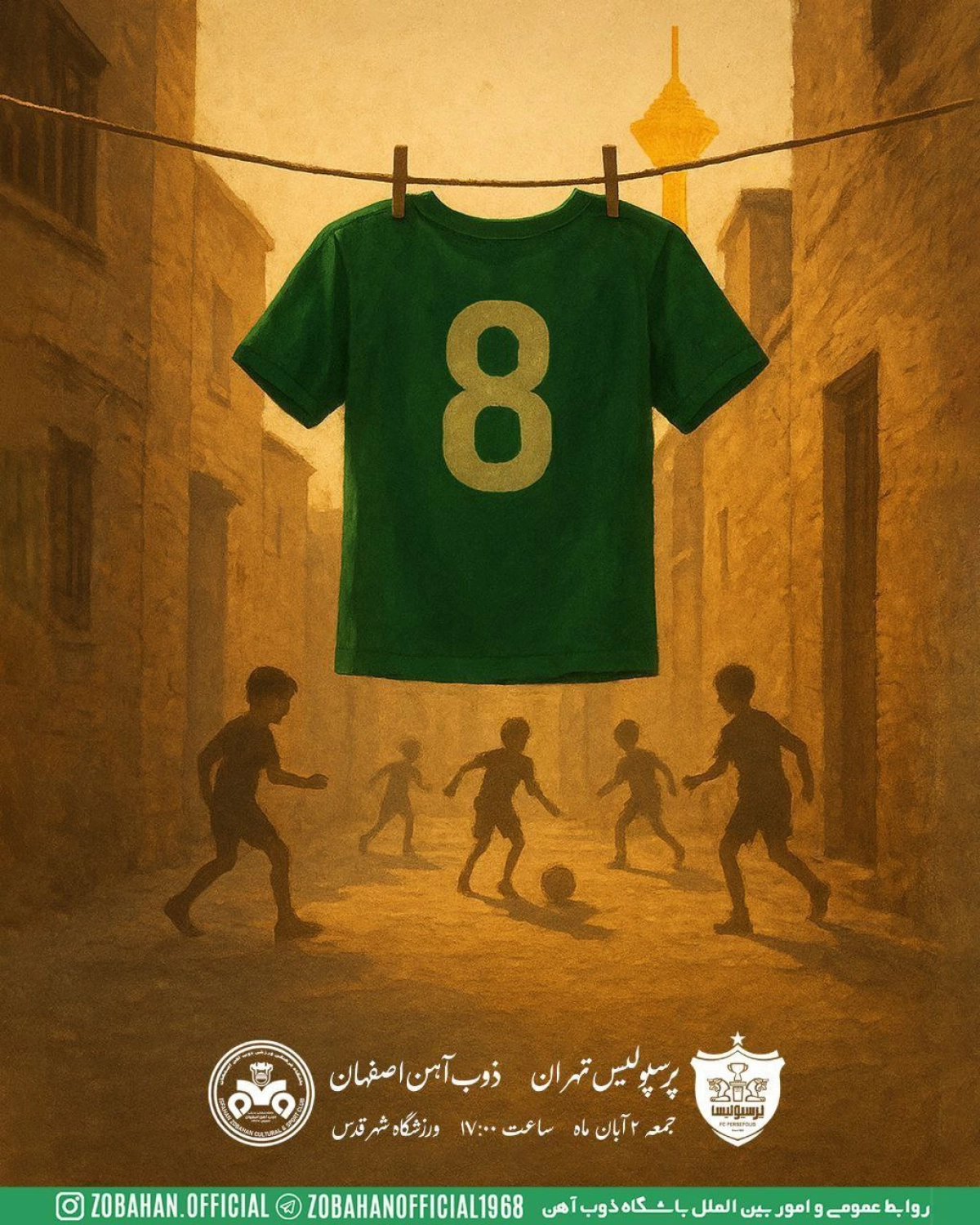 پوستر پیشبازی منتشر شده توسط باشگاه ذوبآهن، با محوریت پیراهن شماره ۸ این تیم که سالها بر تن قاسم حدادیفر، اسطوره بیبدیل سبزپوشان اصفهانی بود، طراحی شده است. این طرح، پیراهن نمادین حدادیفر را در کوچهپسکوچههای قدیمی تهران به تصویر کشیده است.