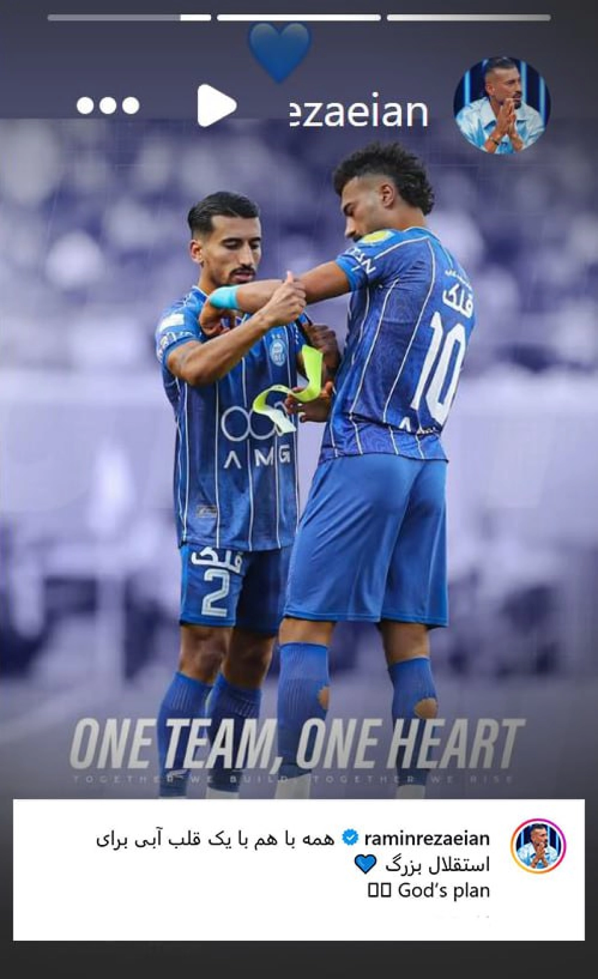 رامین رضاییان، یکی از کاپیتانهای تیم استقلال، به شایعات حواشی نیمکتنشینی و کاپیتانی در استقلال پاسخ داد. او نوشت: ««همه با هم با یک قلب آبی برای استقلال بزرگ».