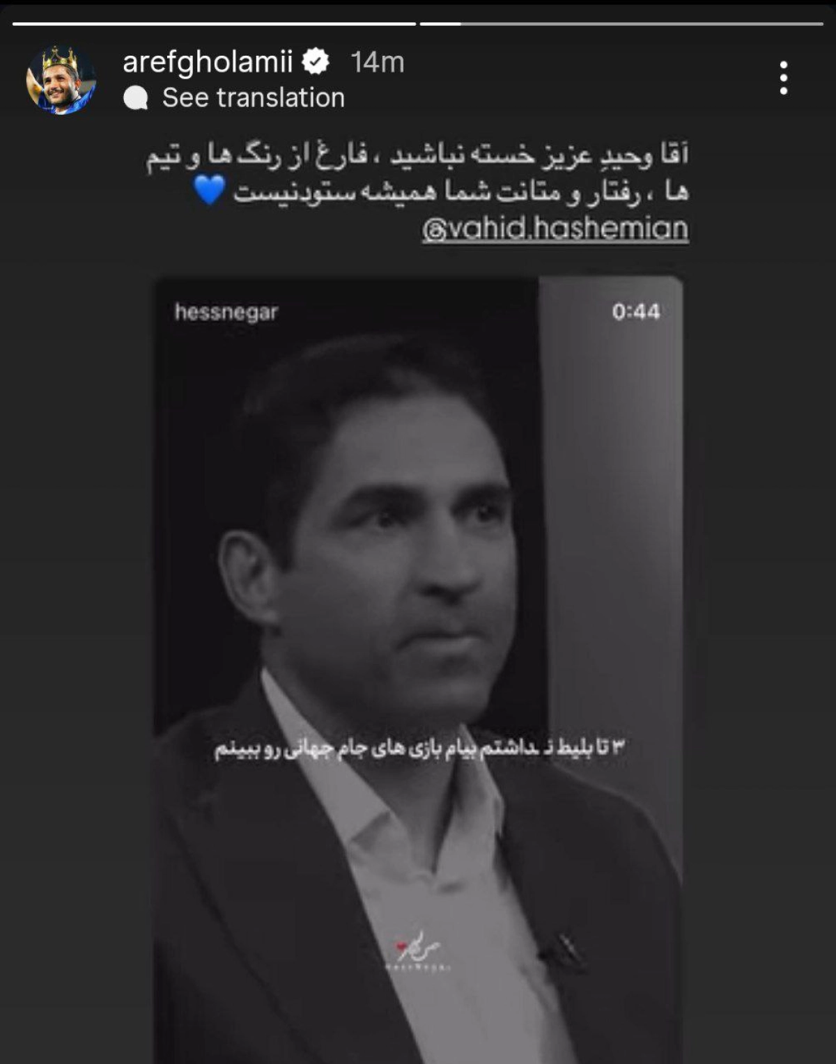 عارف غلامی در استوری خود، با لحنی صمیمانه و توأم با احترام، خطاب به وحید هاشمیان نوشت: «آقا وحید عزیز خسته نباشید، فارغ از رنگ‌ها و تیم‌ها، رفتار و متانت شما همیشه ستودنی است.»