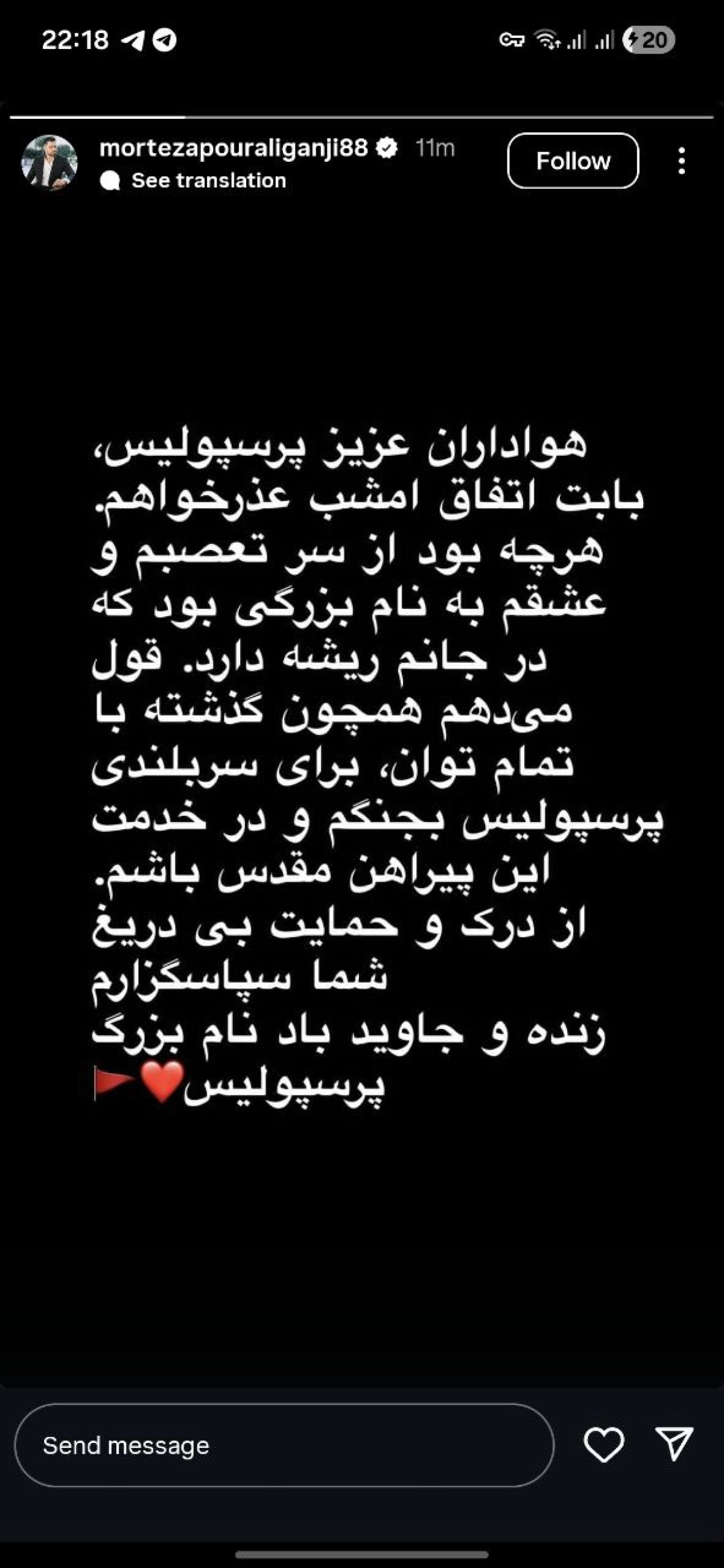 عذرخواهی مجازی پورعلیگنجی از هواداران پرسپولیس + عکس