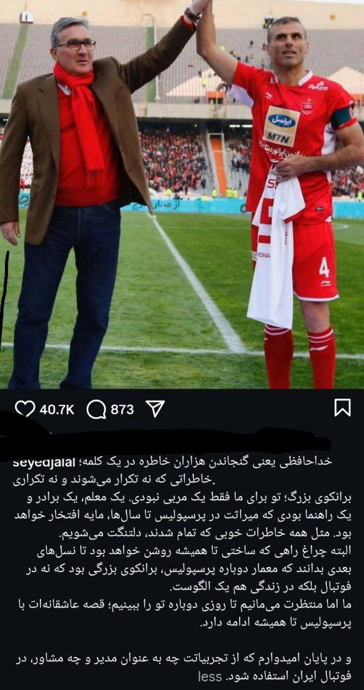 پست «سیدجلال حسینی» در واقع بازتابی از خاطرات مشترکی است که او و هم‌تیمی‌هایش در دوران حضور «برانکو» بر روی نیمکت پرسپولیس تجربه کرده‌اند. دوران پر از جام و افتخاری که نه تنها در تاریخ باشگاه، بلکه در قلب هواداران این تیم نیز جاودانه شده است. او با این اقدام، نشان داد که حتی پس از پایان همکاری و خداحافظی از میادین، پیوندهای عمیق انسانی و احترام متقابل همچنان پابرجاست.