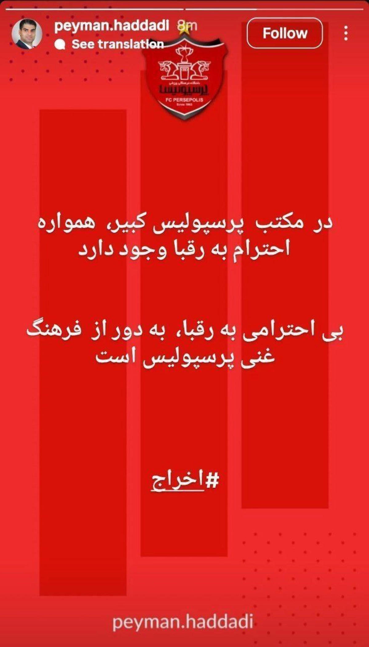 پیمان حدادی، مدیرعامل باشگاه پرسپولیس، با اعلام این خبر، در ادامه و در واکنش به این اتفاقات، با انتشار یک استوری در صفحه شخصی خود، تأکید کرد: «بیاحترامی به رقبا، به دور از فرهنگ غنی پرسپولیس است.»