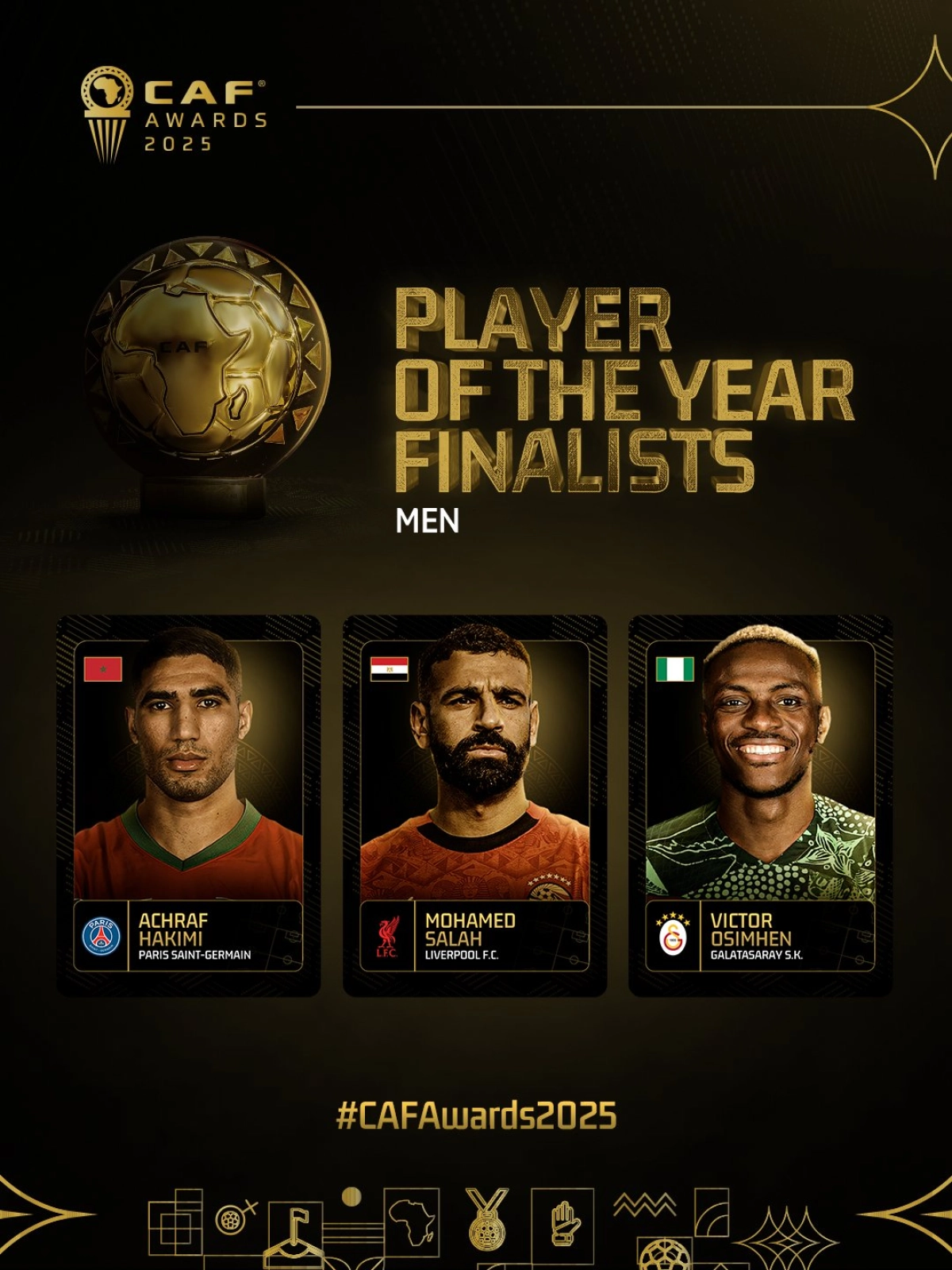 سومین نامزد، ویکتور اوسیمن، فصل گذشته را بیرون از پنج لیگ معتبر اروپا گذراند؛ تصمیمی که با واکنش‌های زیادی روبه‌رو شد. با این حال اوسیمن با پیراهن گالاتاسارای فصل درخشانی را تجربه کرد و در ۴۱ مسابقه، ۳۷ گل به ثمر رساند. در مراسم توپ طلای ۲۰۲۵، صلاح در رتبه چهارم و حکیمی در جایگاه ششم قرار گرفتند، در حالی که اوسیمن در میان ۳۰ نامزد برتر حضور نداشت.