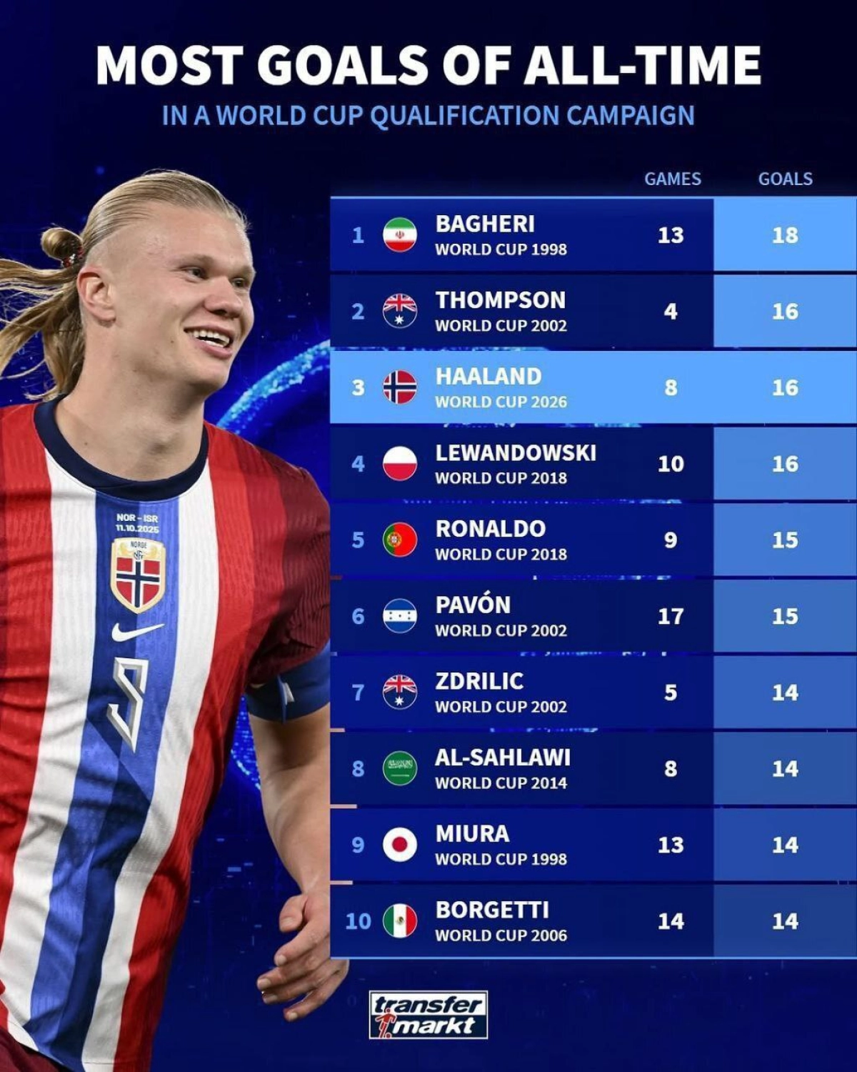 ارلینگ هالند، مهاجم گلزن و نامآشنای تیم ملی نروژ و باشگاه منچسترسیتی، دیشب در دیدار مقابل ایتالیا موفق به ثبت بریس شد و تعداد گلهای خود را در مرحله انتخابی جام جهانی ۲۰۲۶ به عدد ۱۶ رساند. با این حال، این درخشش برای شکستن رکورد بیشترین گل زده در یک دوره از رقابتهای انتخابی جام جهانی در تمامی قارهها کافی نبود. این رکورد همچنان در اختیار ستاره سابق فوتبال ایران، کریم باقری، با ۱۸ گل زده در سال ۱۹۹۸ قرار دارد.