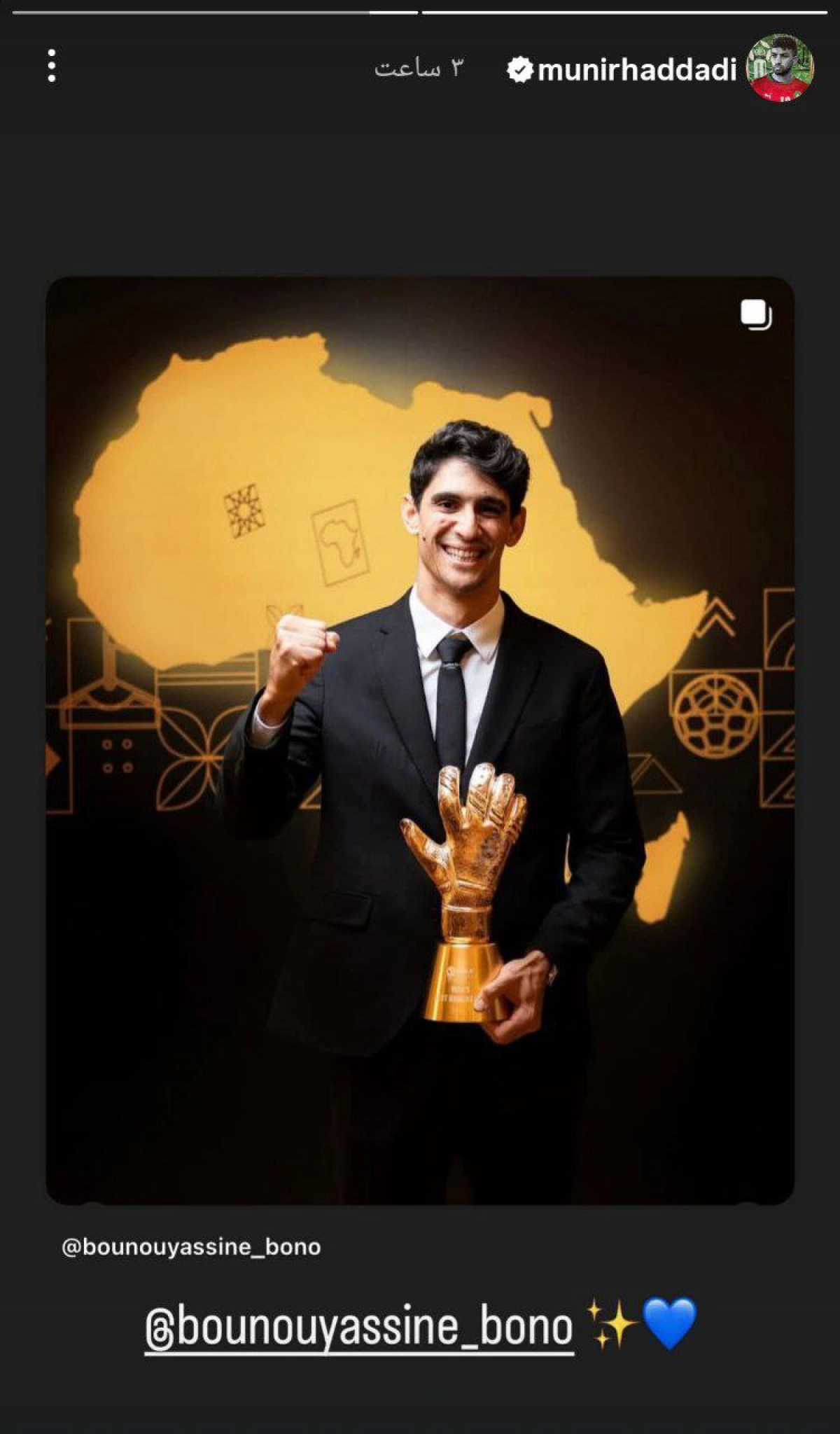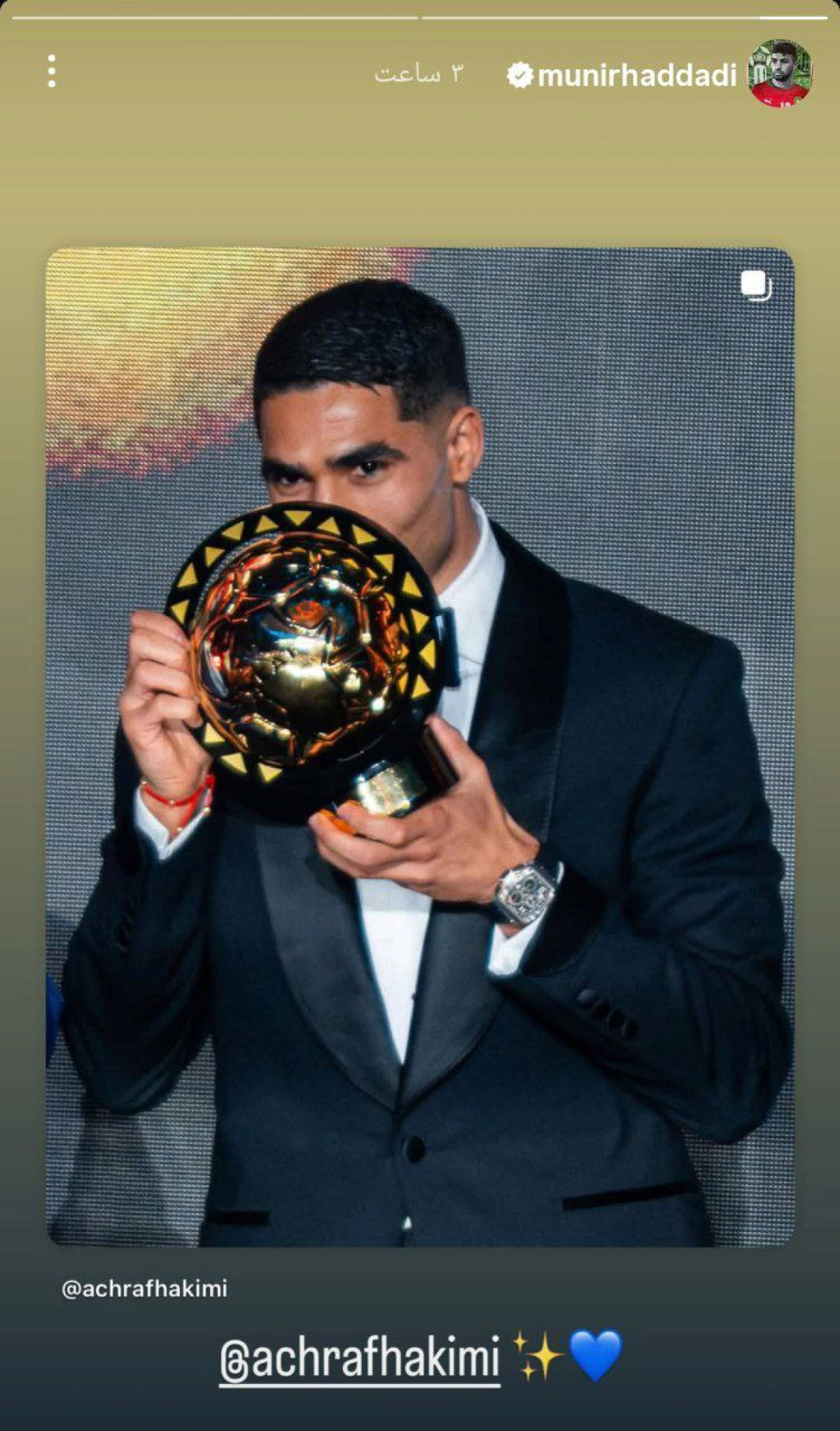 منیر الحدادی، بازیکن مراکشی تیم فوتبال استقلال، پس از اعلام برندگان جوایز بهترین بازیکن و بهترین دروازهبان سال آفریقا، با انتشار تصاویری از هموطنانش، اشرف حکیمی و یاسین بونو، این افتخار بزرگ را به آنها تبریک گفت.
