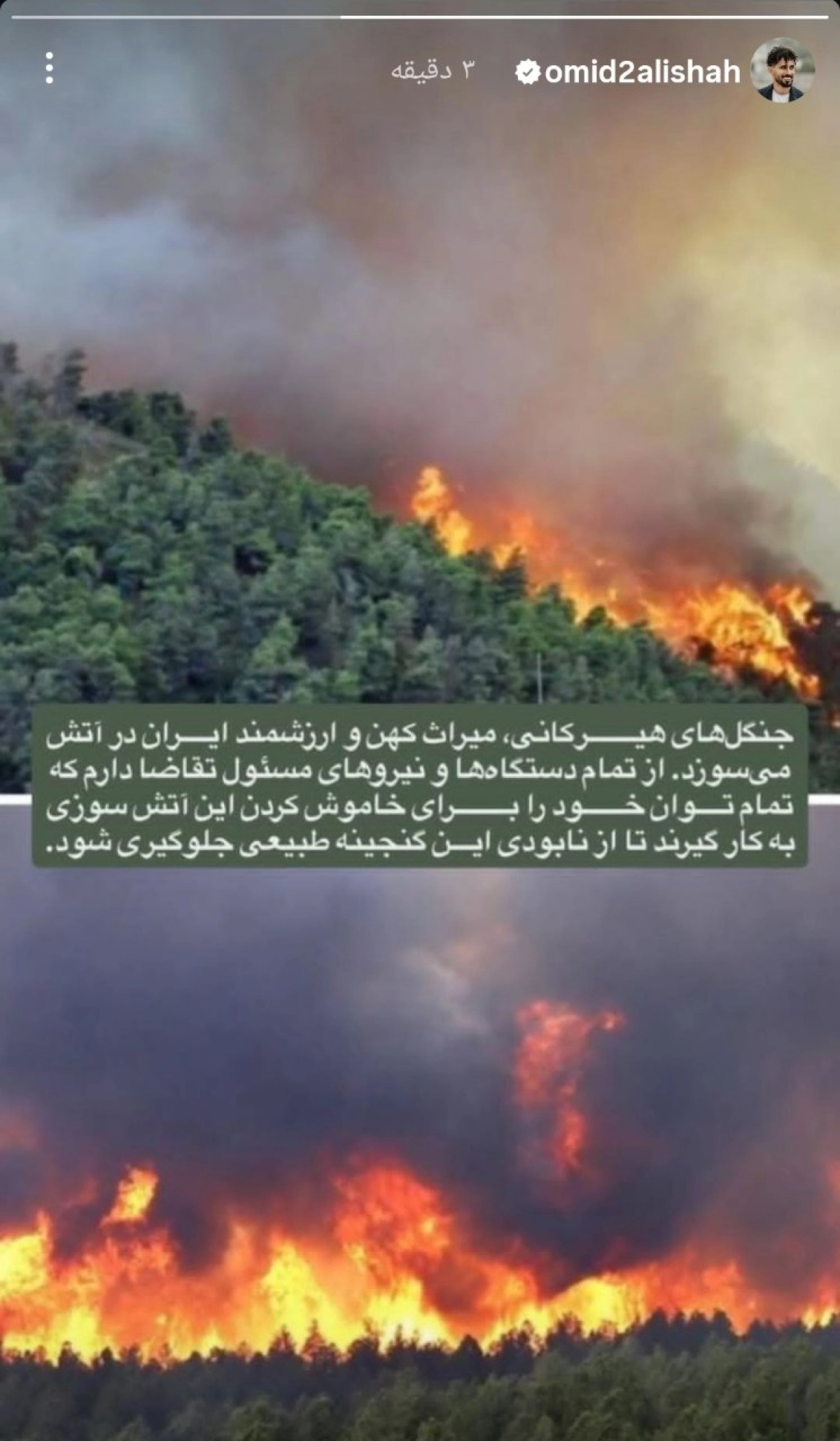 امید عالیشاه، کاپیتان تیم فوتبال پرسپولیس، با انتشار یک استوری در صفحه شخصی خود، نسبت به آتشسوزی گسترده در جنگلهای هیرکانی واکنش نشان داد و از مسئولان و نیروهای امدادی خواست تا تمام تلاش خود را برای مهار این آتشسوزی و جلوگیری از نابودی این گنجینه طبیعی به کار گیرند.