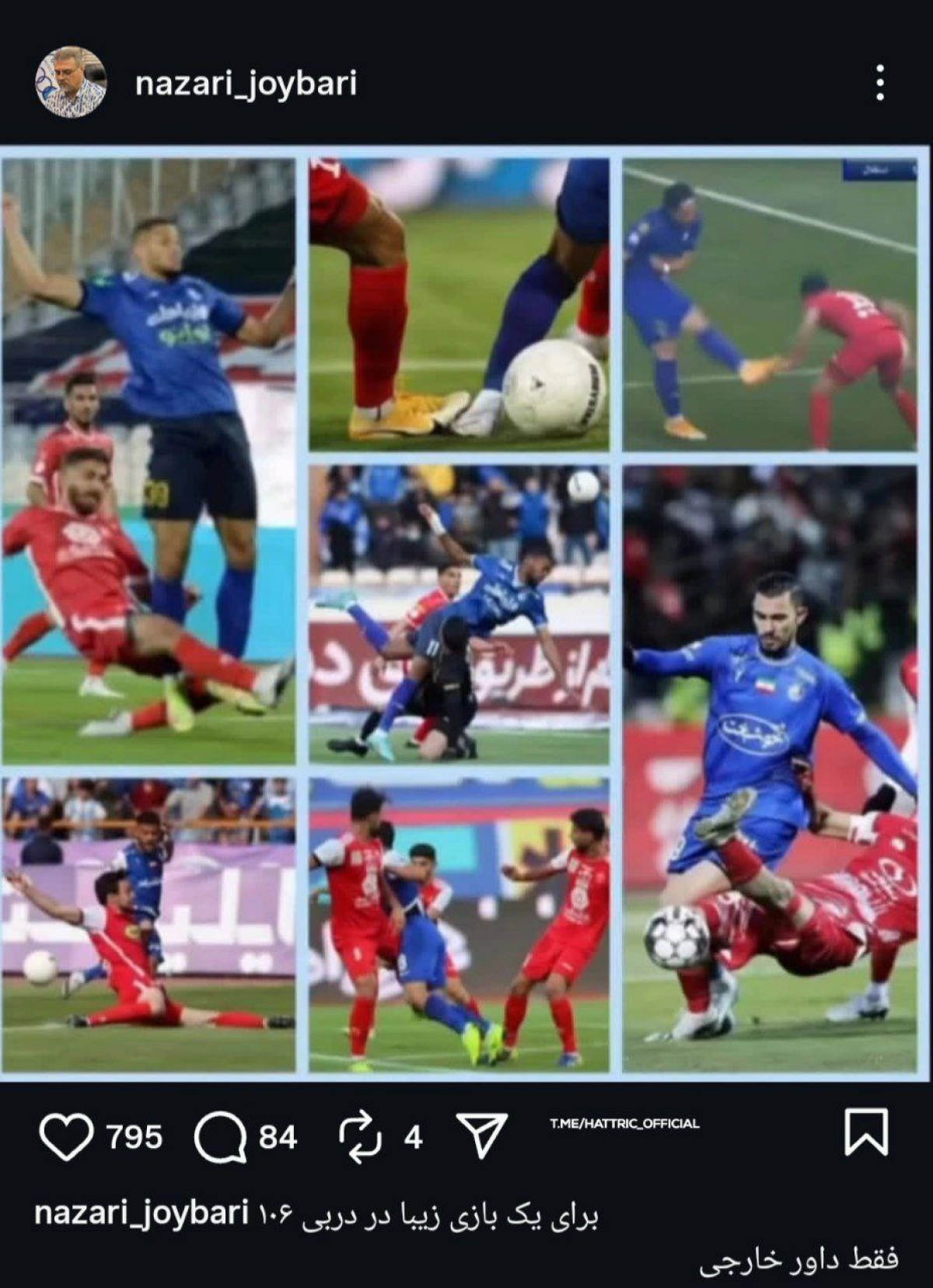 به گزارش سایت رسمی فوتبال برتر؛ علی نظری جویباری، عضو هیئتمدیره باشگاه استقلال، با انتشار پستی جنجالی در صفحه اینستاگرام خود، بار دیگر بحث داوری دربی پایتخت را داغ کرد.