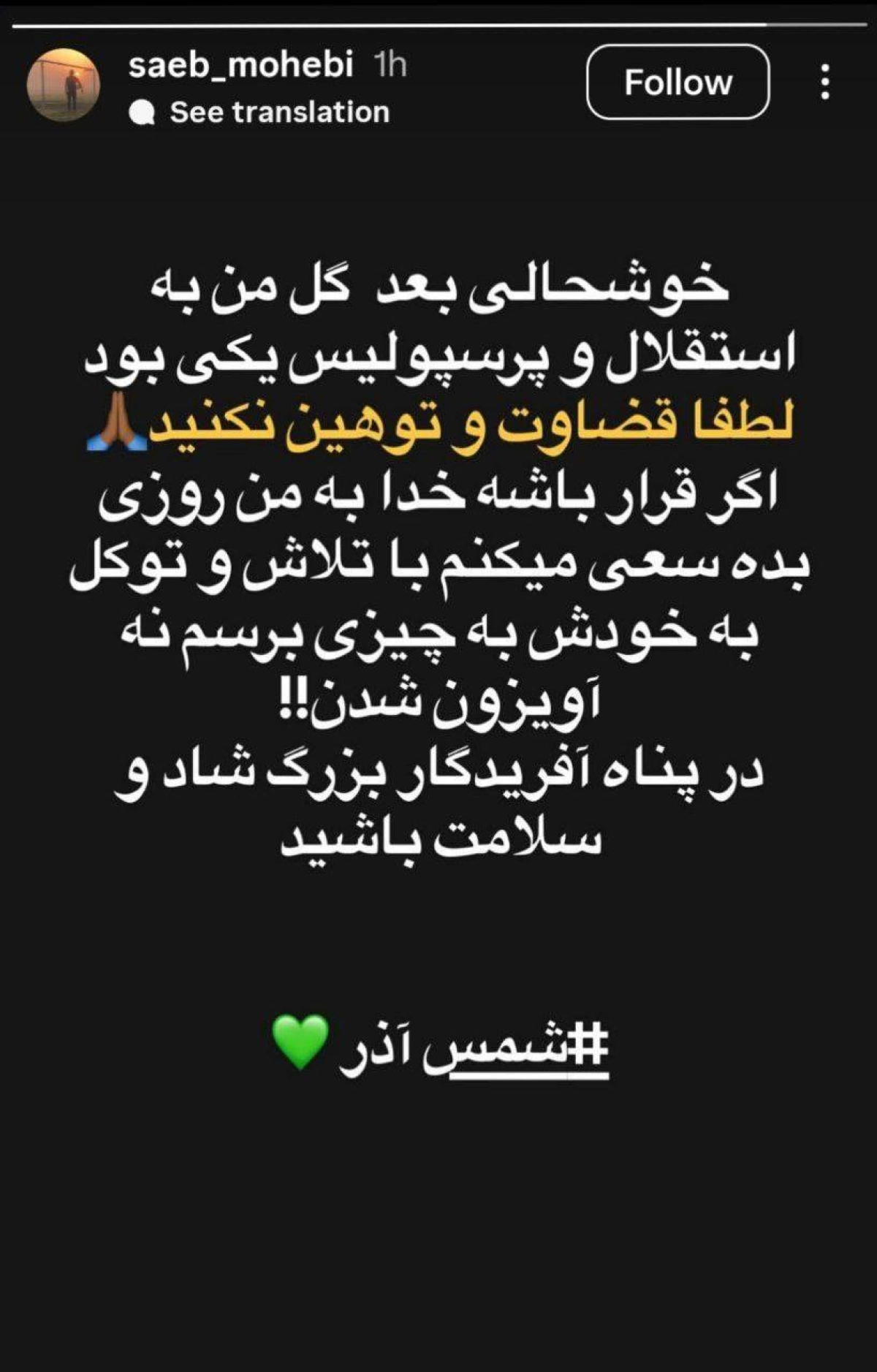صائب محبی در واکنش به این گمانهزنیها و برای شفافسازی و رفع سوءتفاهمها، در یک استوری اینستاگرامی نوشت: «خوشحالی بعد از گل من به استقلال و پرسپولیس یکی بود لطفا قضاوت و توهین نکنید اگر قرار باشد خدا به من روزی بدهد سعی میکنم با تلاش و توکل به خودش به چیزی برسم نه آویزان شدن!! در پناه آفریدگار بزرگ شاد و سلامت باشید.» او با این پیام، به صراحت اعلام کرد که حرکتش ارتباطی به تیم خاصی نداشته و رویکرد او در شادی پس از گل همواره یکسان بوده است.