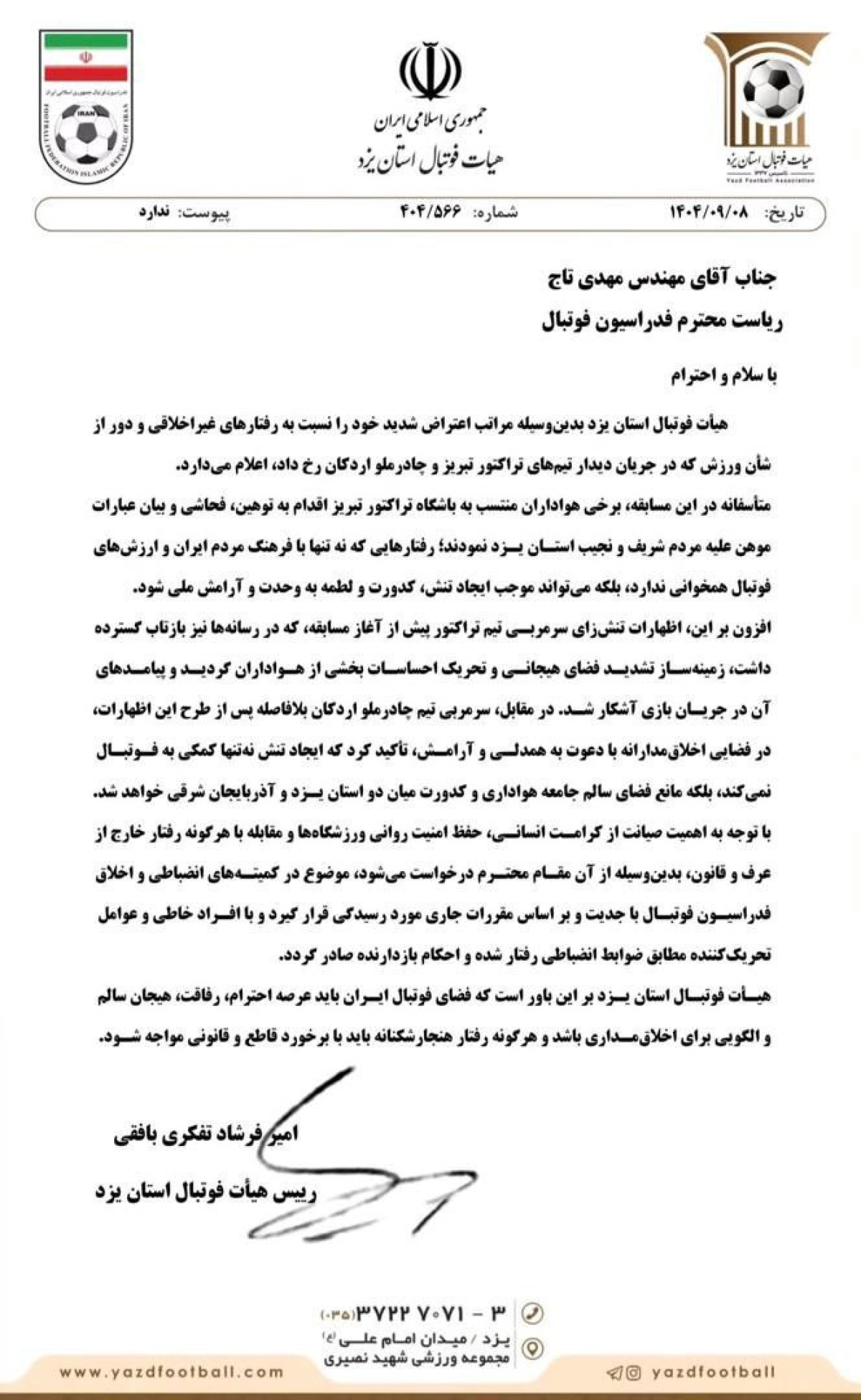در بخشی از این نامه آمده است: «در این مسابقه برخی هواداران باشگاه تراکتور، اقدام به توهین و حواشی به مردم استان یزد نمودند که با فرهنگ مردم و ارزشهای فوتبال همخوانی ندارد. کمیته اخلاق و انضباطی رسیدگی کند.»