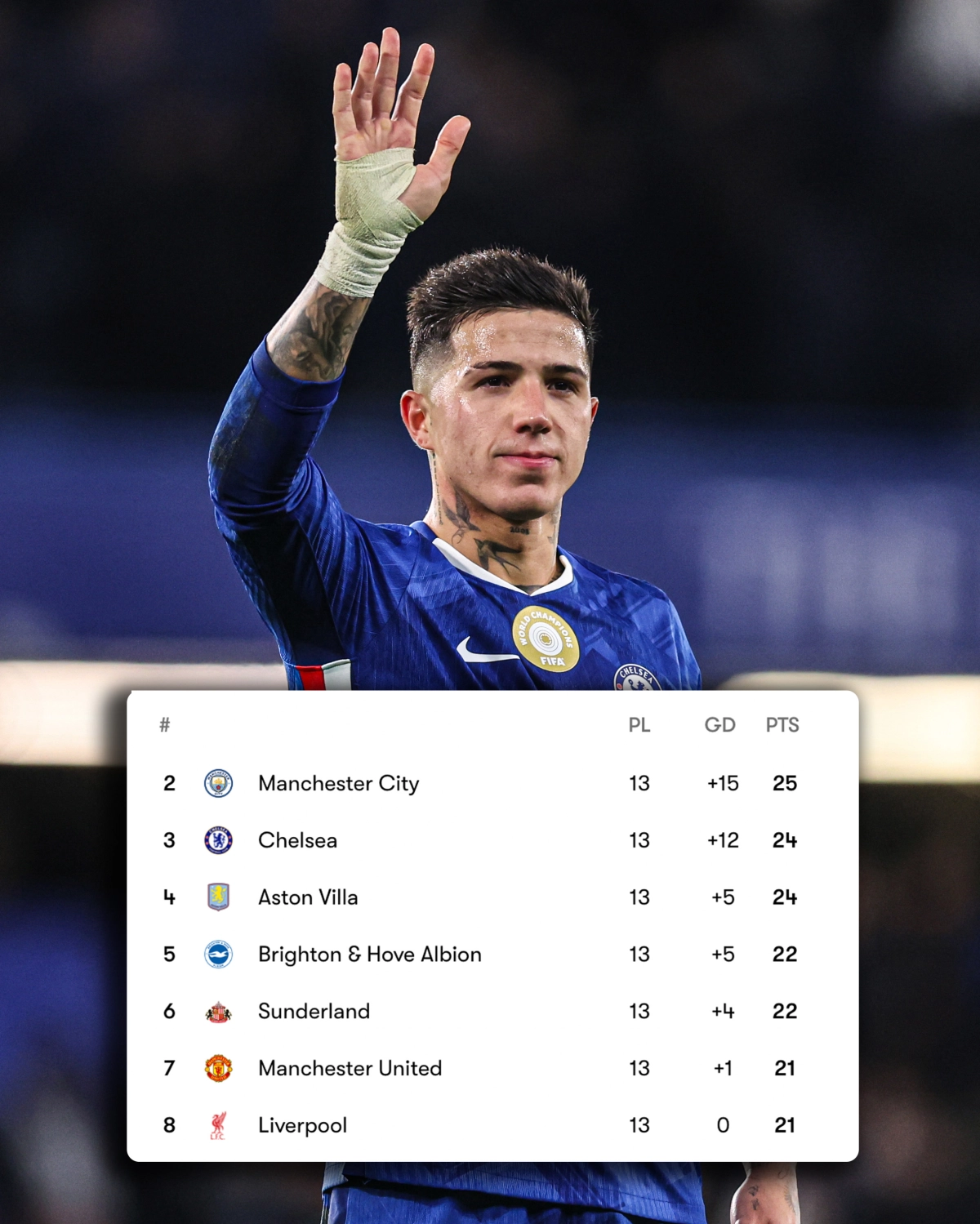 پس از این دو تیم، برایتون و ساندرلند به عنوان میهمانهای ناخوانده بالای جدول ۲۲ امتیازی هستند و منچستریونایتد و لیورپول ۲۱ امتیازی نیز در جایگاههای هفتم و هشتم قرار گرفتهاند. البته نباید از فرم خوب کریستال پالاس، بورنموث و برنتفورد نیز گذشت.