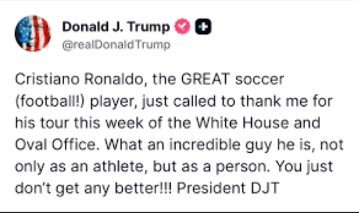 دونالد ترامپ، با انتشار توییتی در فضای مجازی، از تماس تلفنی کریستیانو رونالدو خبر داد و از او به گرمی یاد کرد. ترامپ در این توییت نوشت: «کریستیانو رونالدو، بازیکن بزرگ فوتبال همین الان با من تماس گرفت تا از من به خاطر بازدید این هفته‌اش از کاخ سفید و دفتر بیضی‌شکل تشکر کند. او چه مرد فوق‌العاده‌ای است، نه تنها به عنوان یک ورزشکار، بلکه به عنوان یک شخص. بهتر از این نمی‌شود!!!»