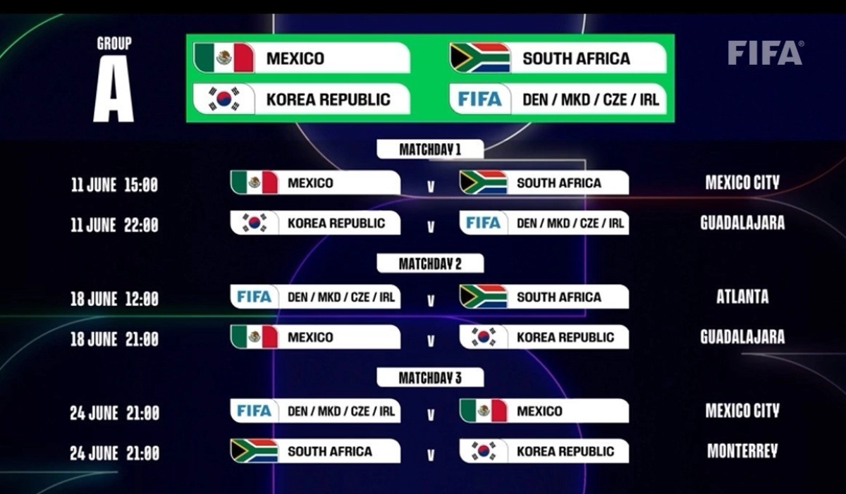 مکزیک – آفریقای جنوبی؛ 21 خرداد؛ ساعت 22:30 (به وقت تهران) ؛ مکزیکوسیتی مکزیک (بازی افتتاحیه)