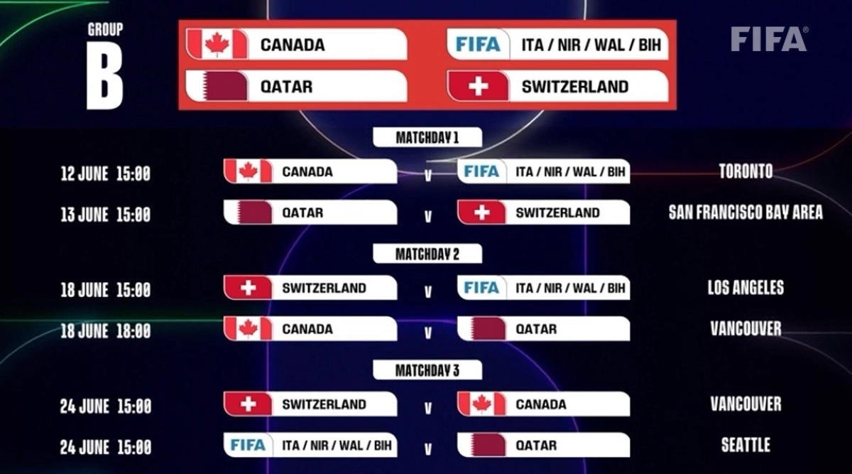 برنده پلیآف(ایتالیا/ایرلندشمالی/ولز/بوسنی) – قطر؛ 3 تیر؛ 22:30 ؛ ونکوور کانادا