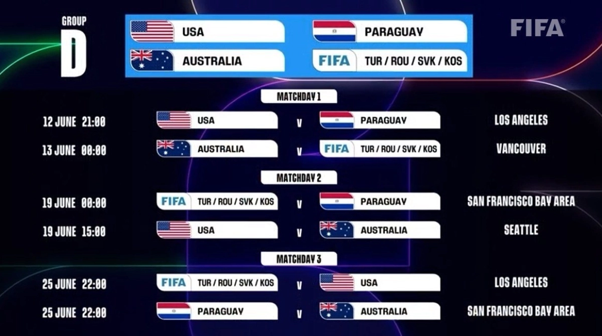 برنده پلیآف (ترکیه/رومانی/اسلواکی/کوزوو) – پاراگوئه؛ 29 خرداد؛ ساعت 07:30؛ سانفرانسیسکوی آمریکا