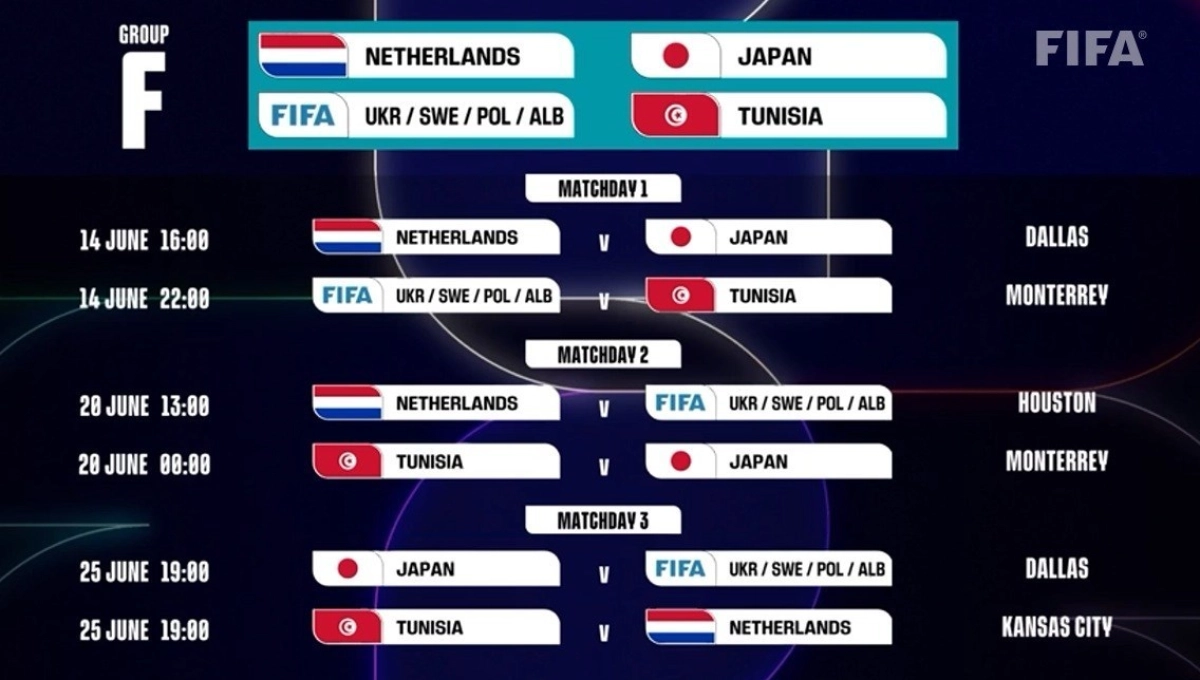 هلند - برنده پلیآف(اوکراین/سوئد/لهستان/آلبانی)؛ 30 خرداد؛ ساعت 20:30؛ هیوستون آمریکا